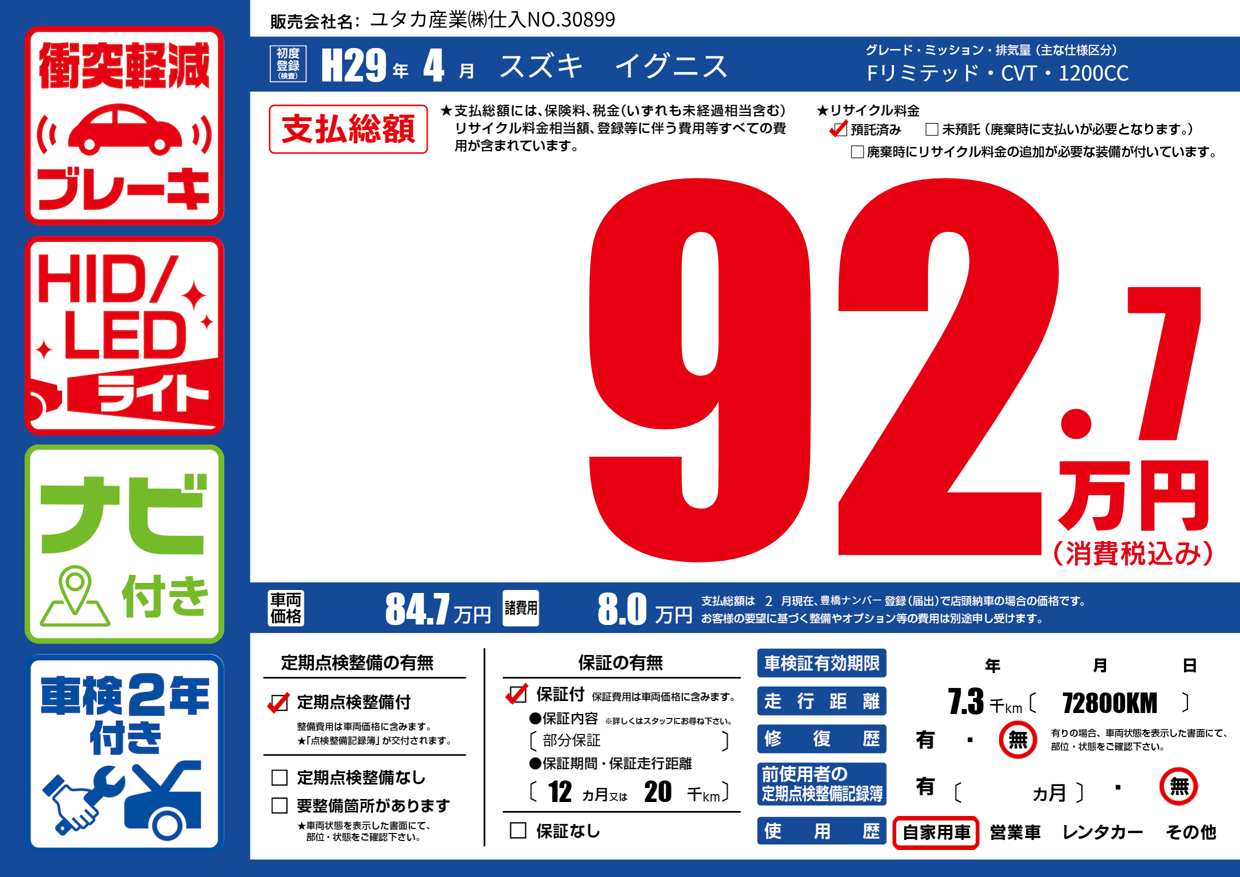 | 車名 | スズキ イグニス | グレード ミッション 排気量 |