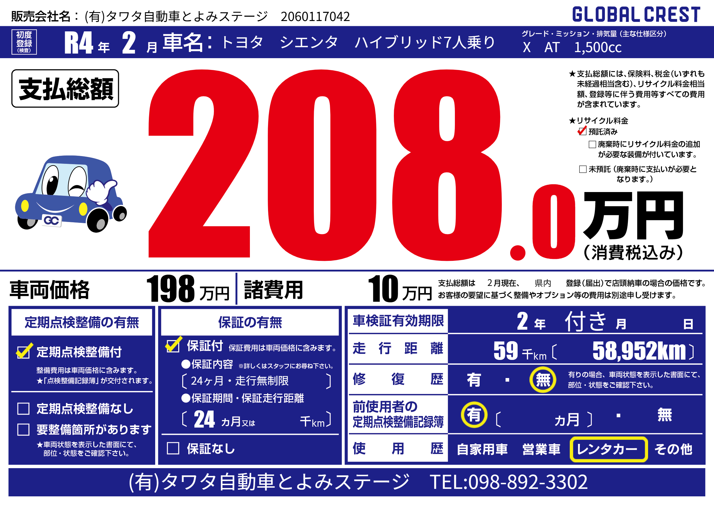 | 車名 | トヨタ シエンタ ハイブリッド7人乗り | グレード ミッション 排気量 |
