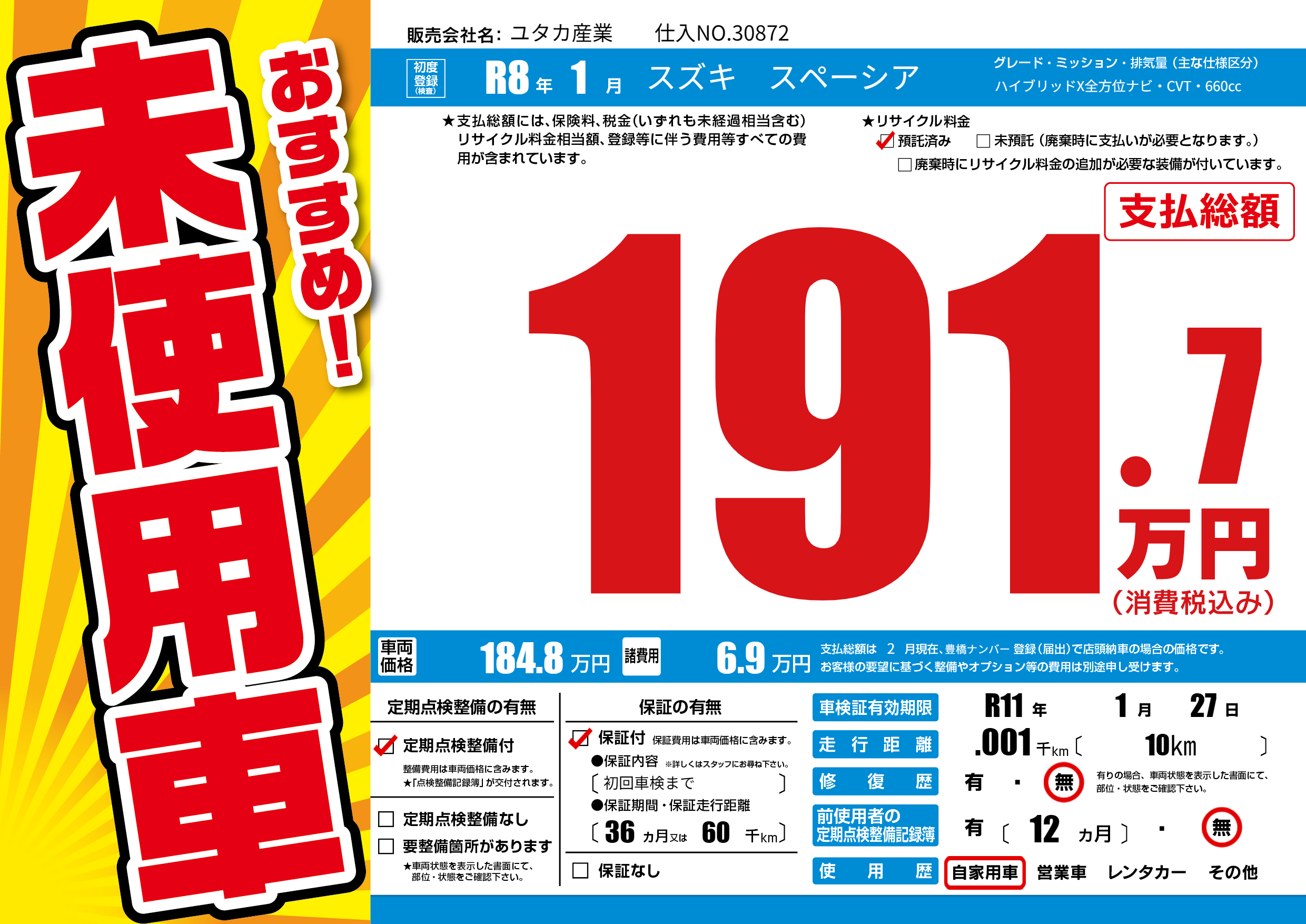 | 走行キロ | - | 初年度登録 | R8年1月 |