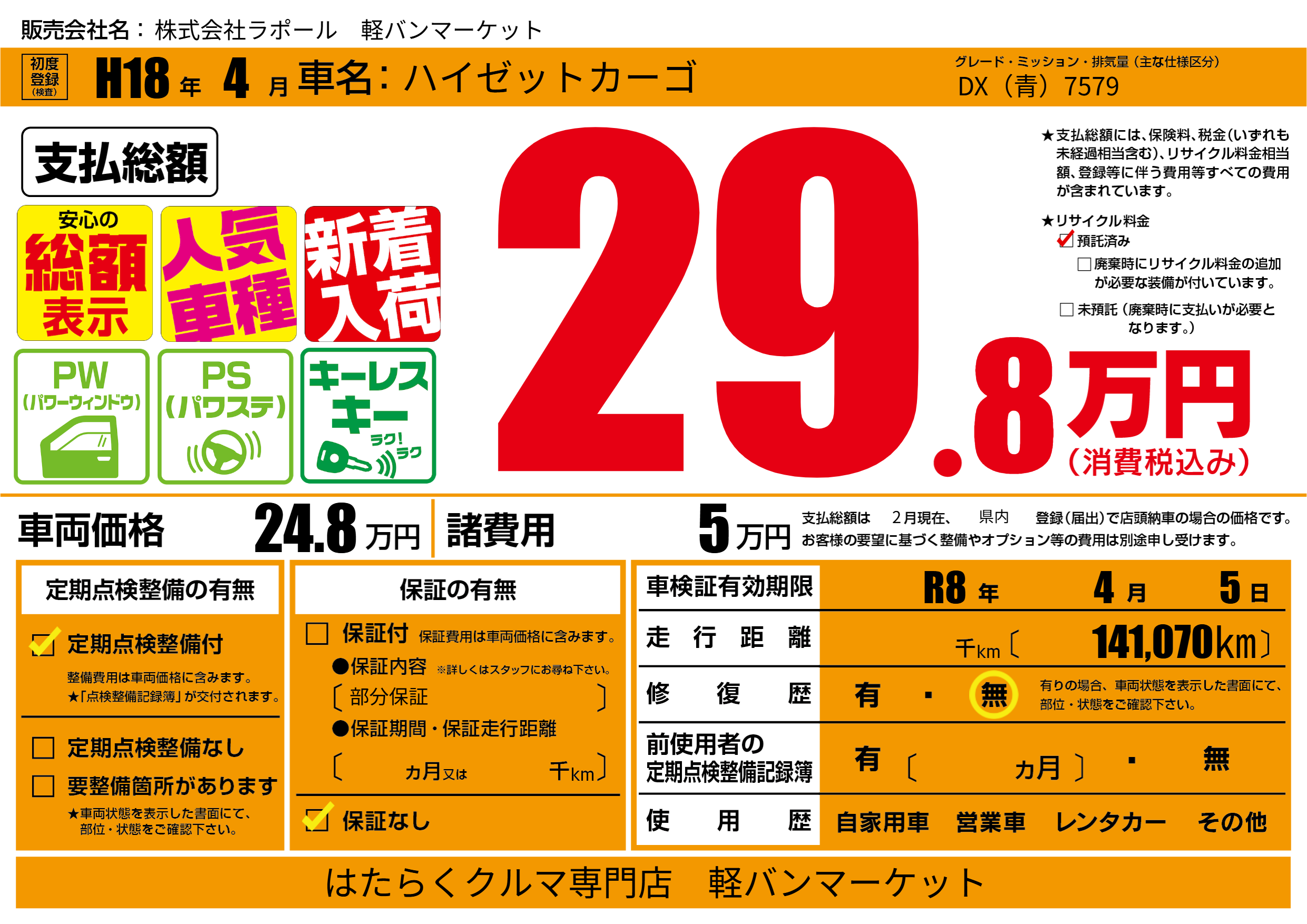 | 車名 | ハイゼットカーゴ | グレード ミッション 排気量 |