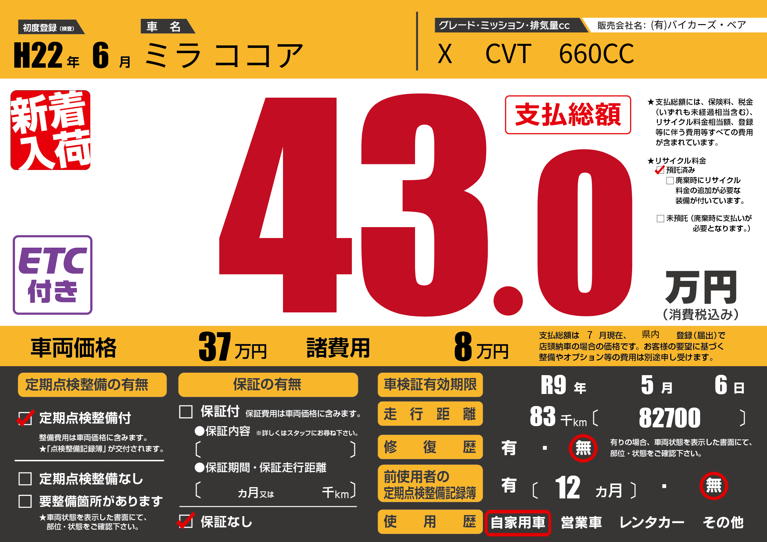 | 車名 | ミラ ココア | グレード ミッション 排気量 |