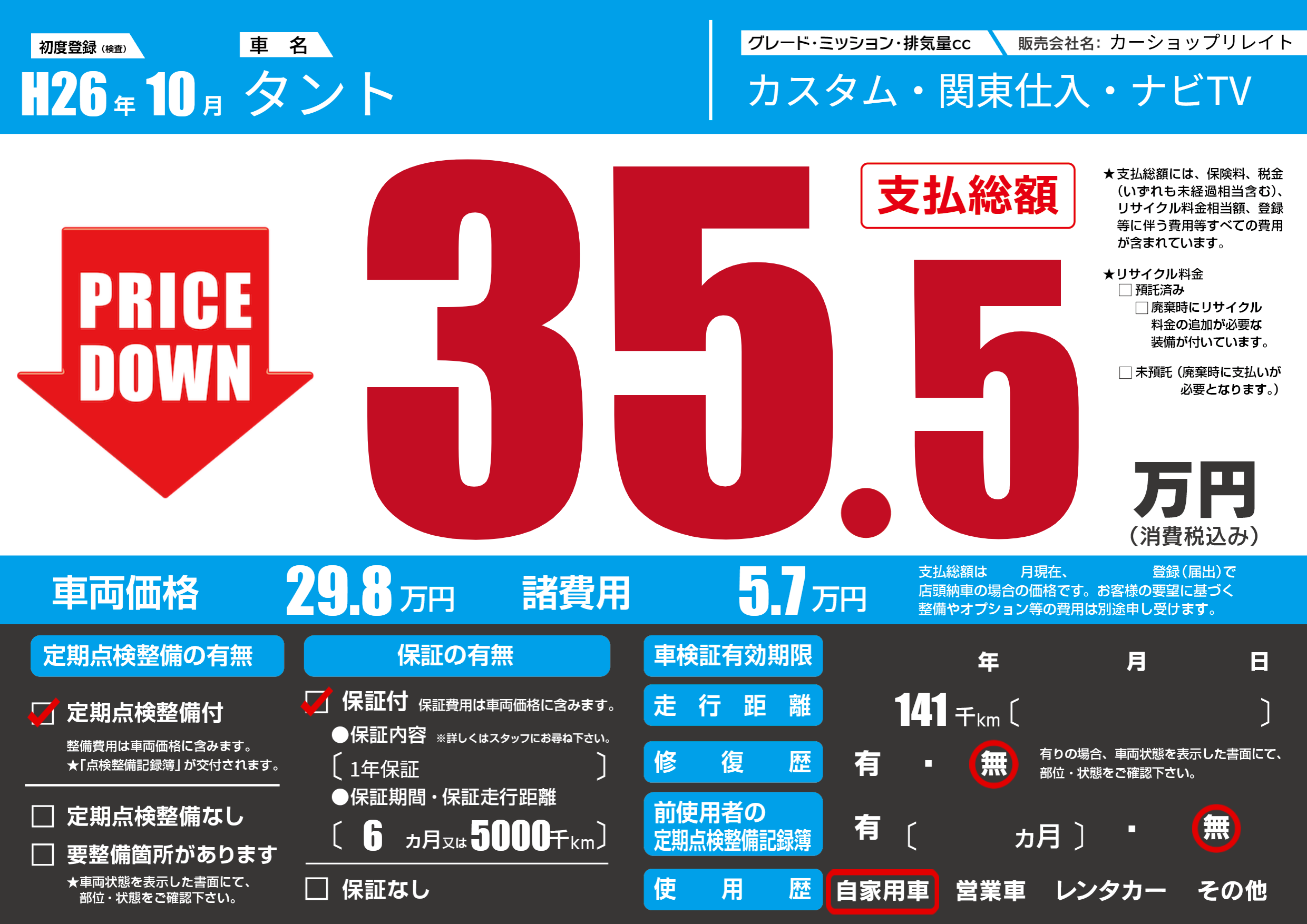 | 走行キロ | 14.1万km | 初年度登録 | H26年10月 |