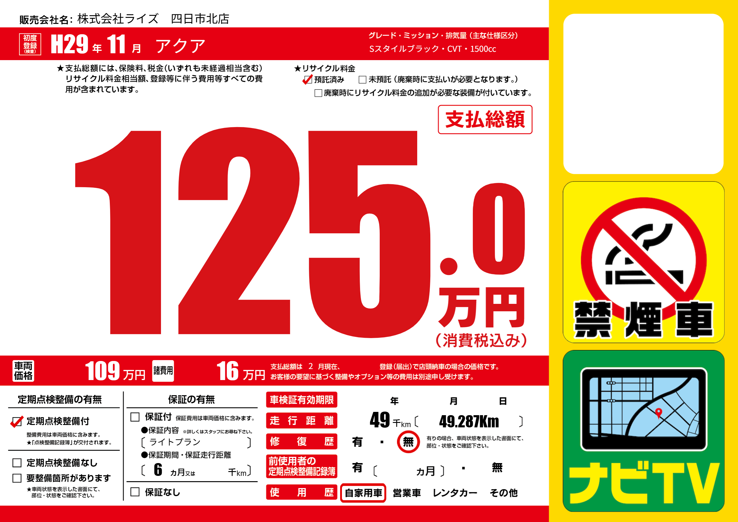 | 走行キロ | 4.9万km | 初年度登録 | H29年11月 |