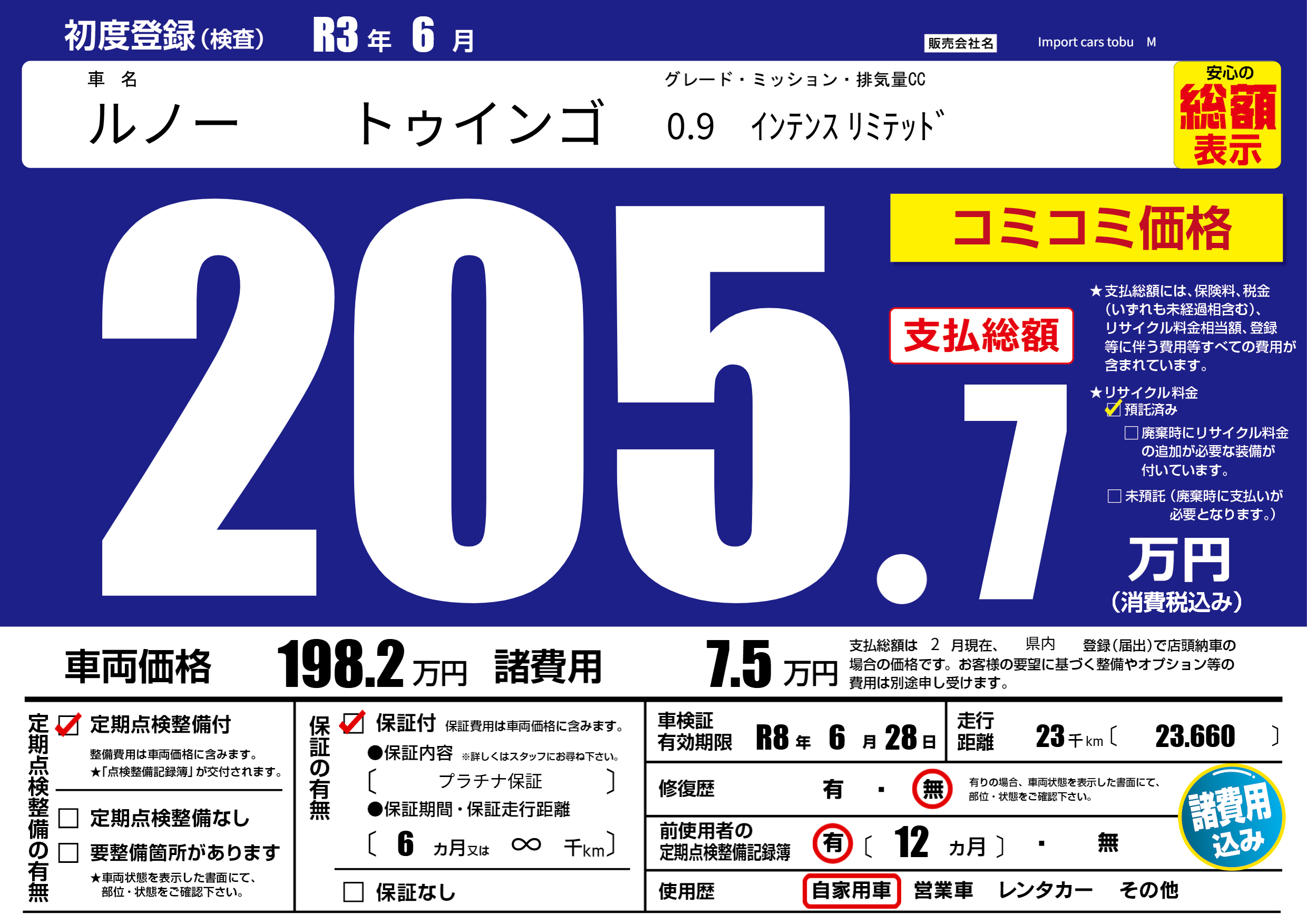 | 車検制限 | R8年 6月 28日 | ||