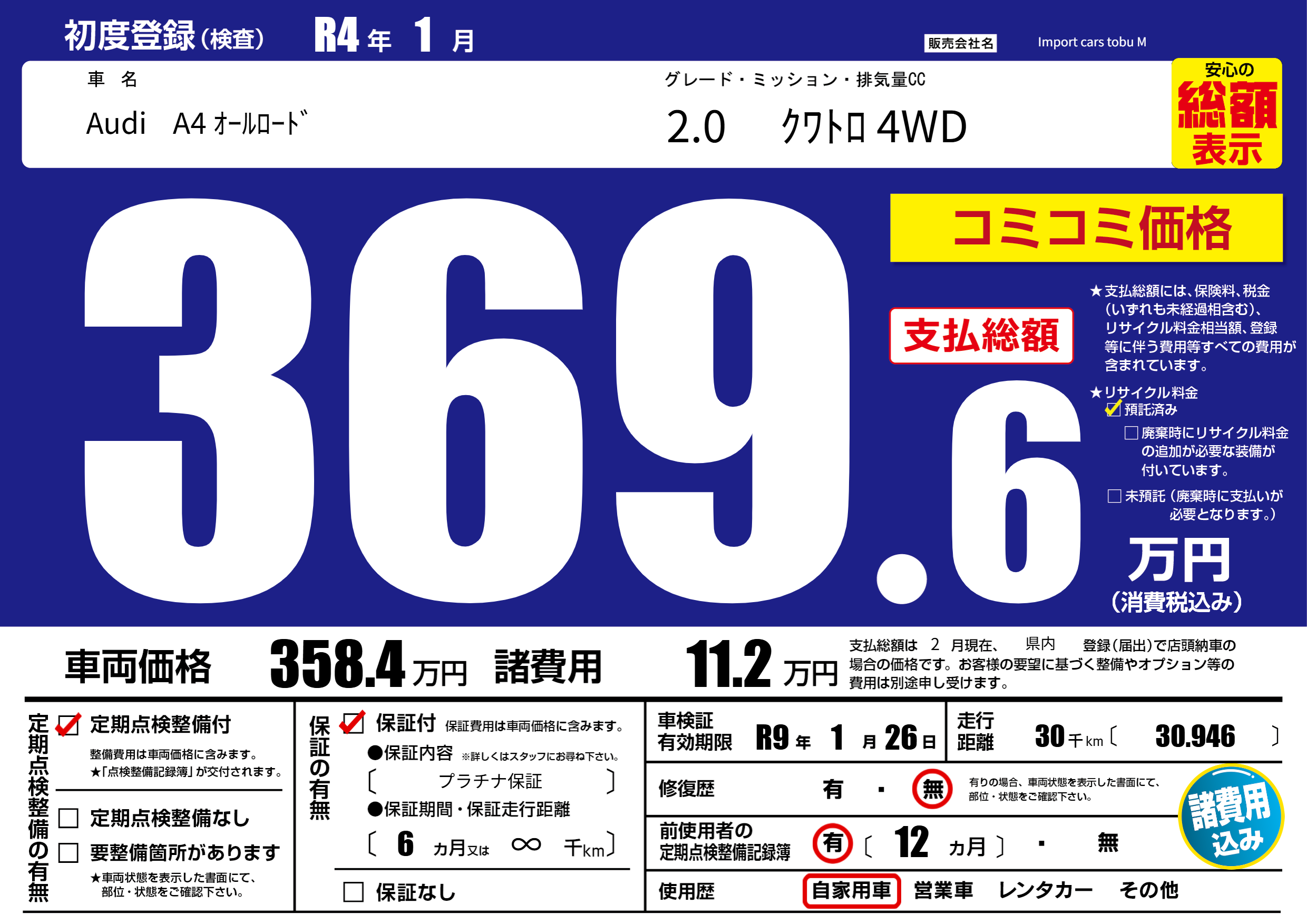 保証付き 保証内容( プラチナ保証) 6ヶ月または(∞)千kmまで |