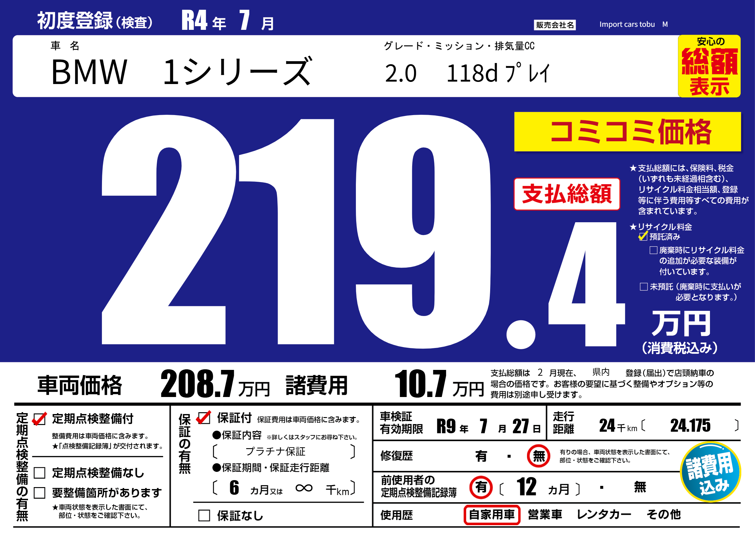 | 車検制限 | R9年 7月 27日 | ||