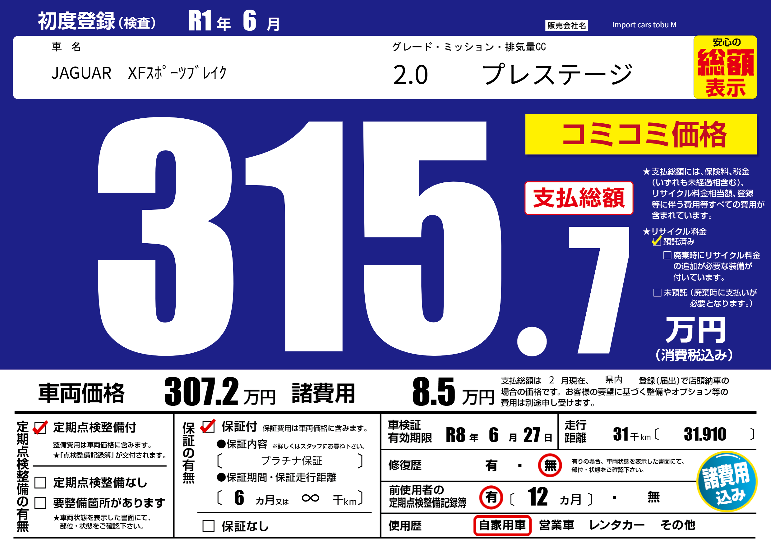 保証付き 保証内容( プラチナ保証) 6ヶ月または(∞)千kmまで |