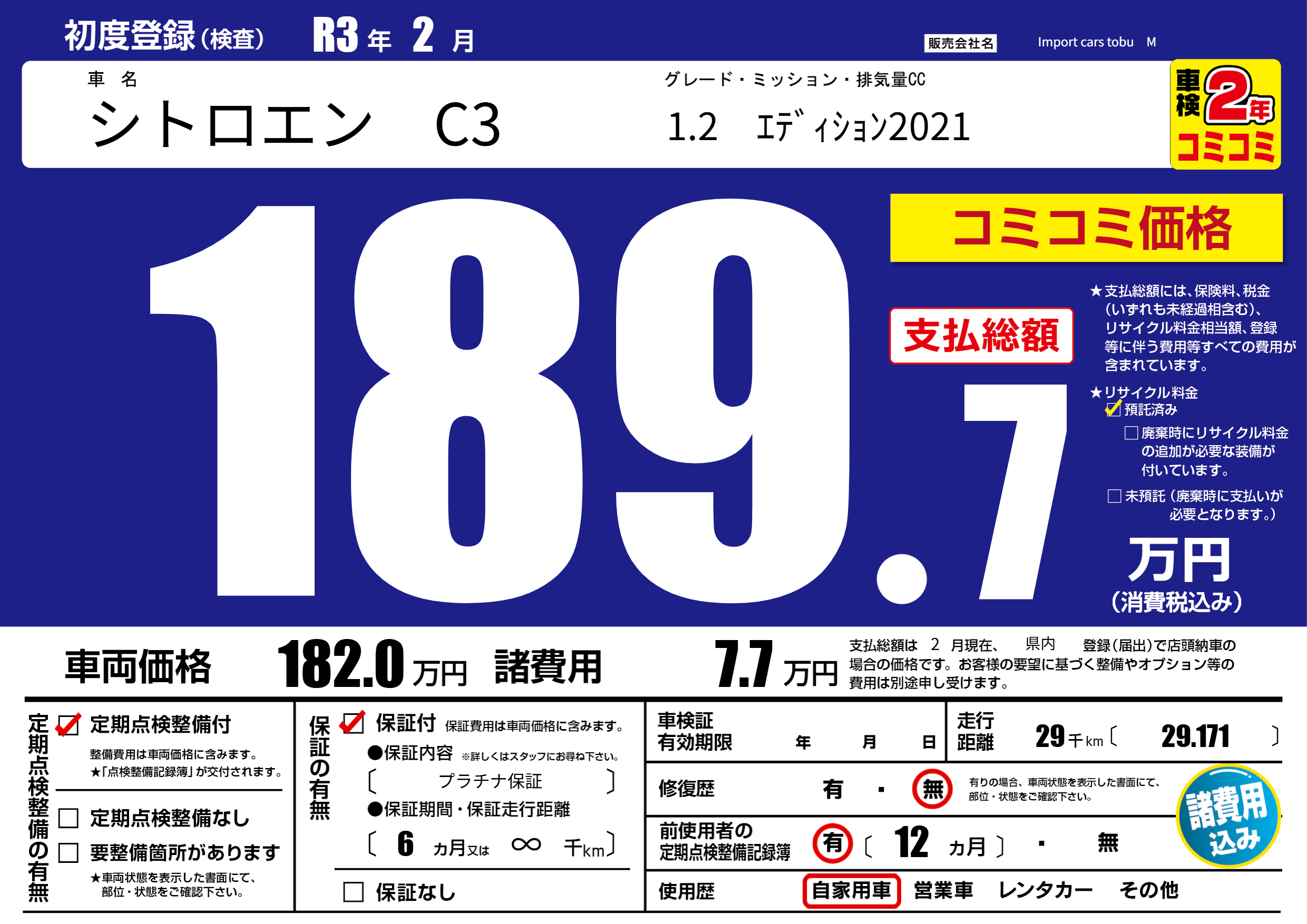 | 走行キロ | 2.9万km | 初年度登録 | R3年2月 |