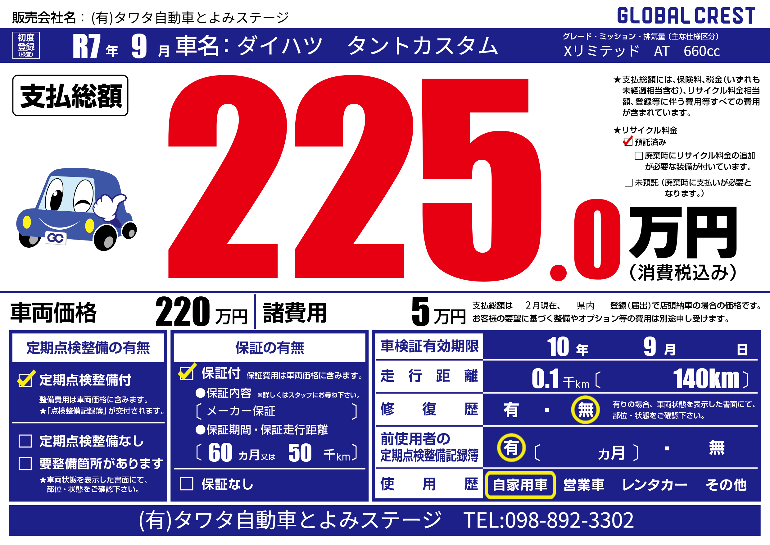 | 走行キロ | - | 初年度登録 | R7年9月 |