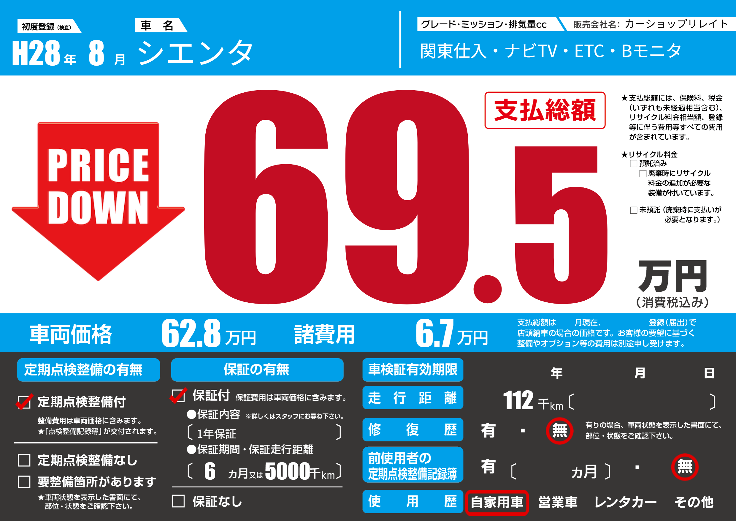 | 走行キロ | 11.2万km | 初年度登録 | H28年8月 |