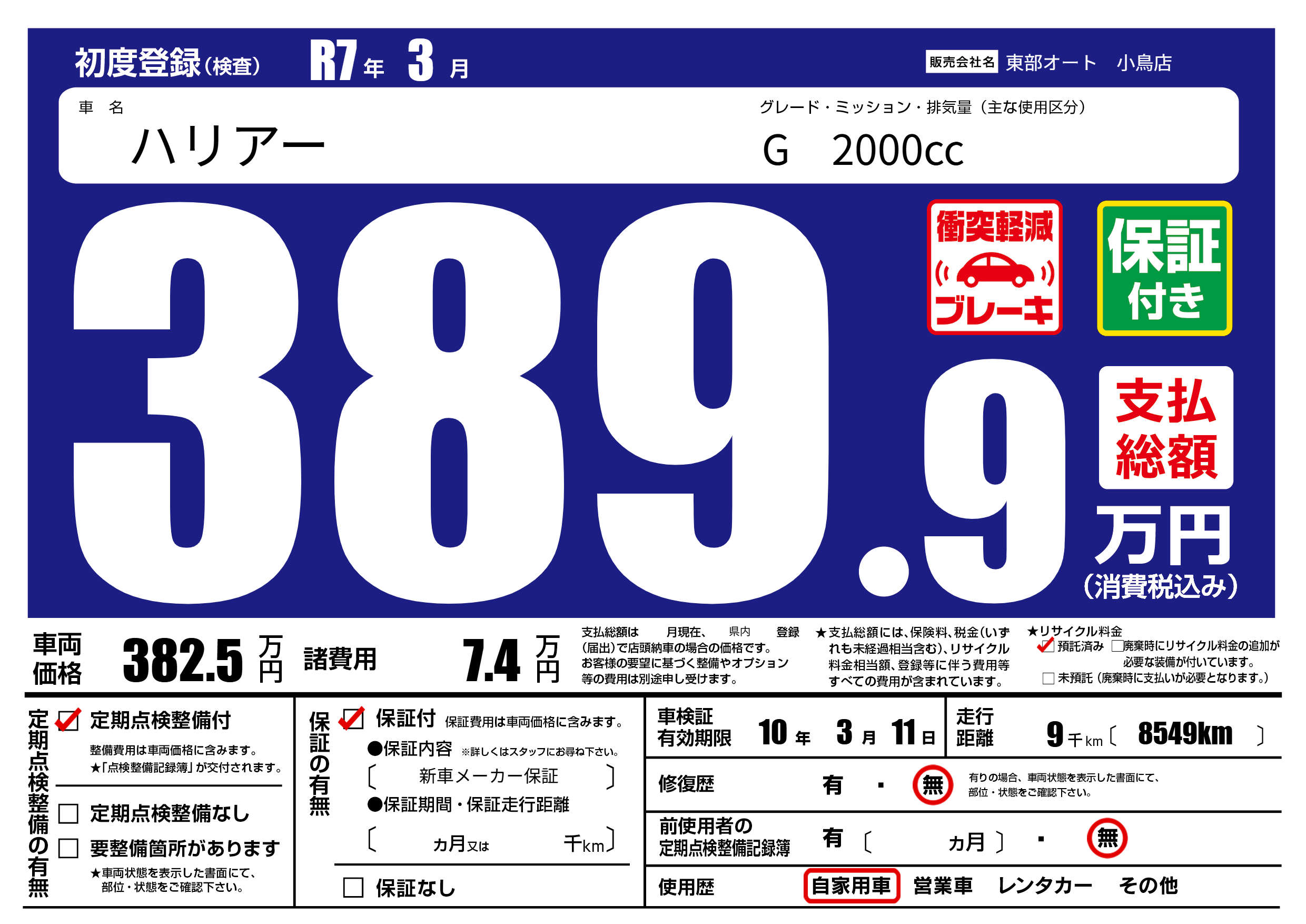 | 走行キロ | 0.9万km | 初年度登録 | R7年3月 |