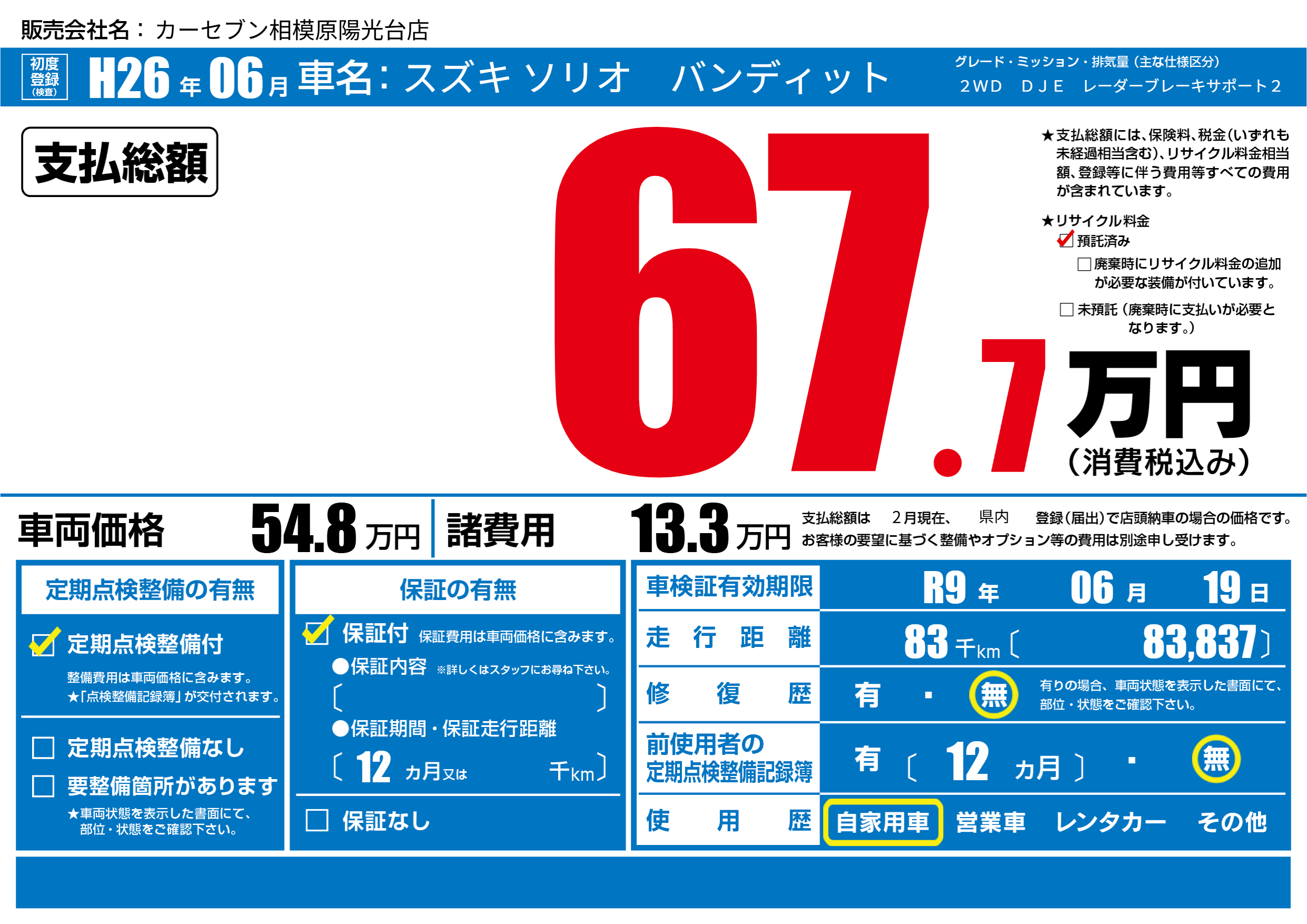 | 走行キロ | 8.3万km | 初年度登録 | H26年06月 |