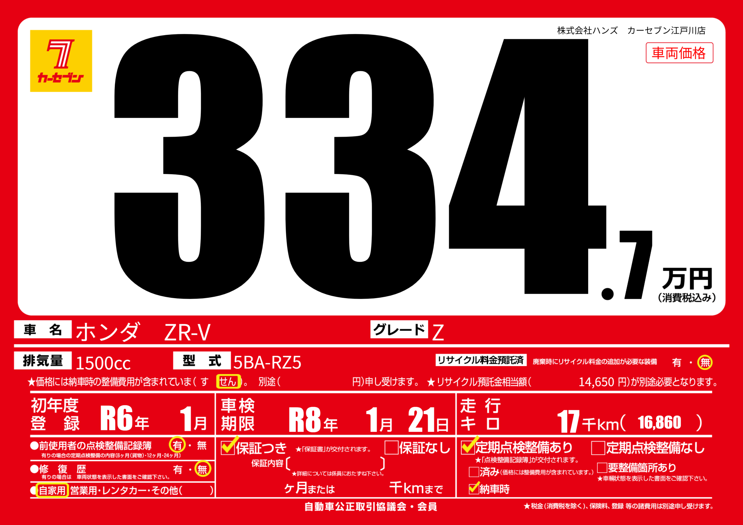 | 車名 | ホンダ ZR-V | グレード ミッション 排気量 |