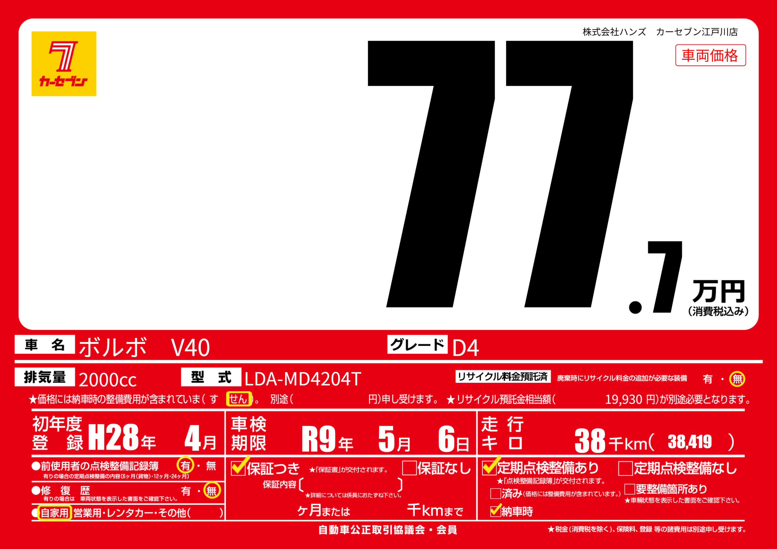 | 車名 | ボルボ V40 | グレード ミッション 排気量 |