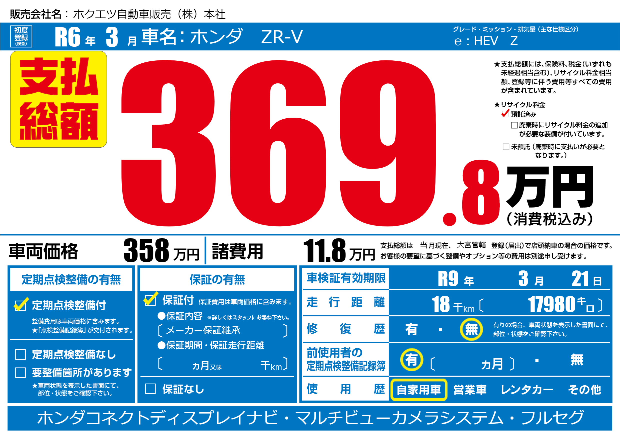 | 車名 | ホンダ ZR-V | グレード ミッション 排気量 |
