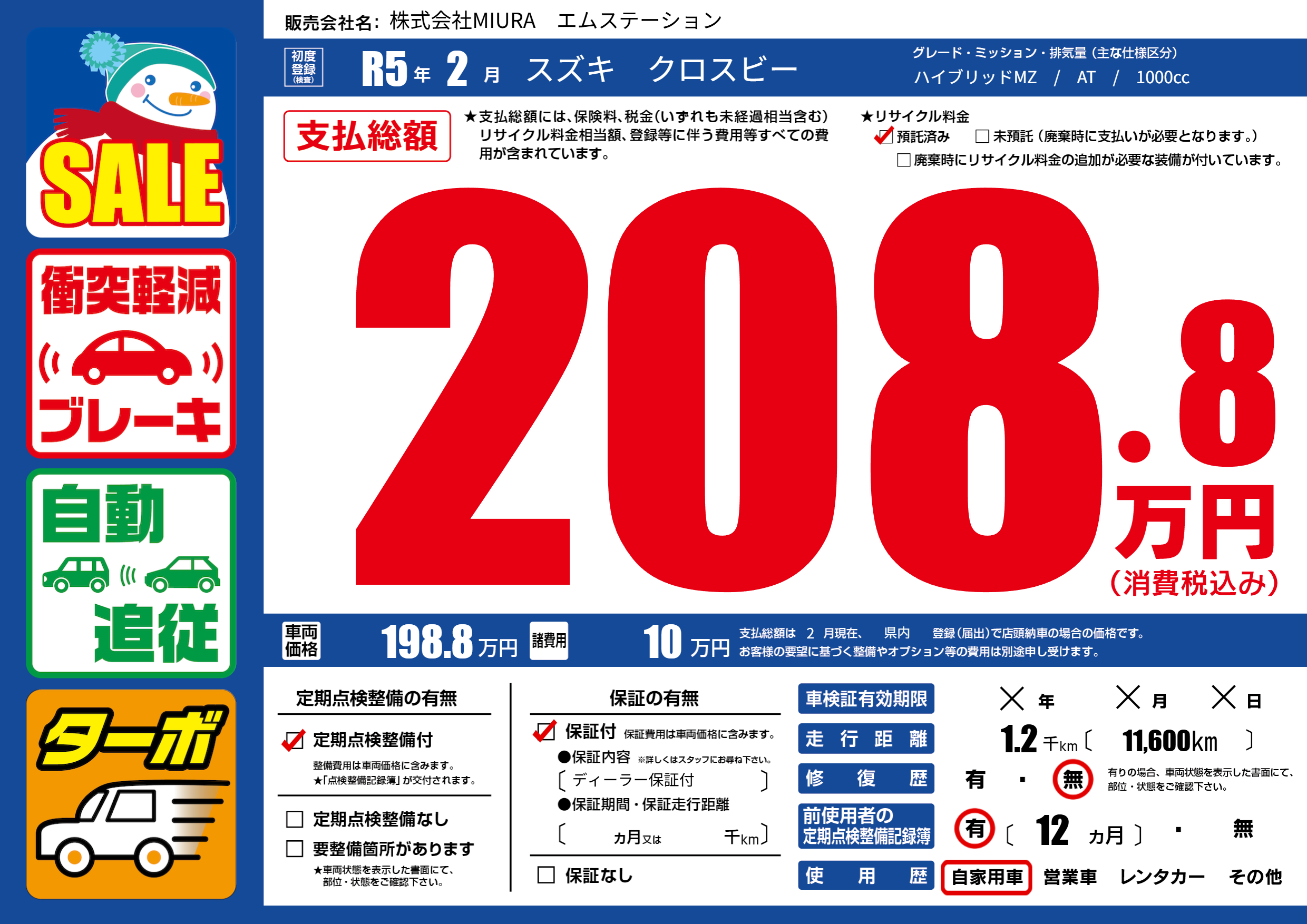 | 走行キロ | 0.1万km | 初年度登録 | R5年2月 |