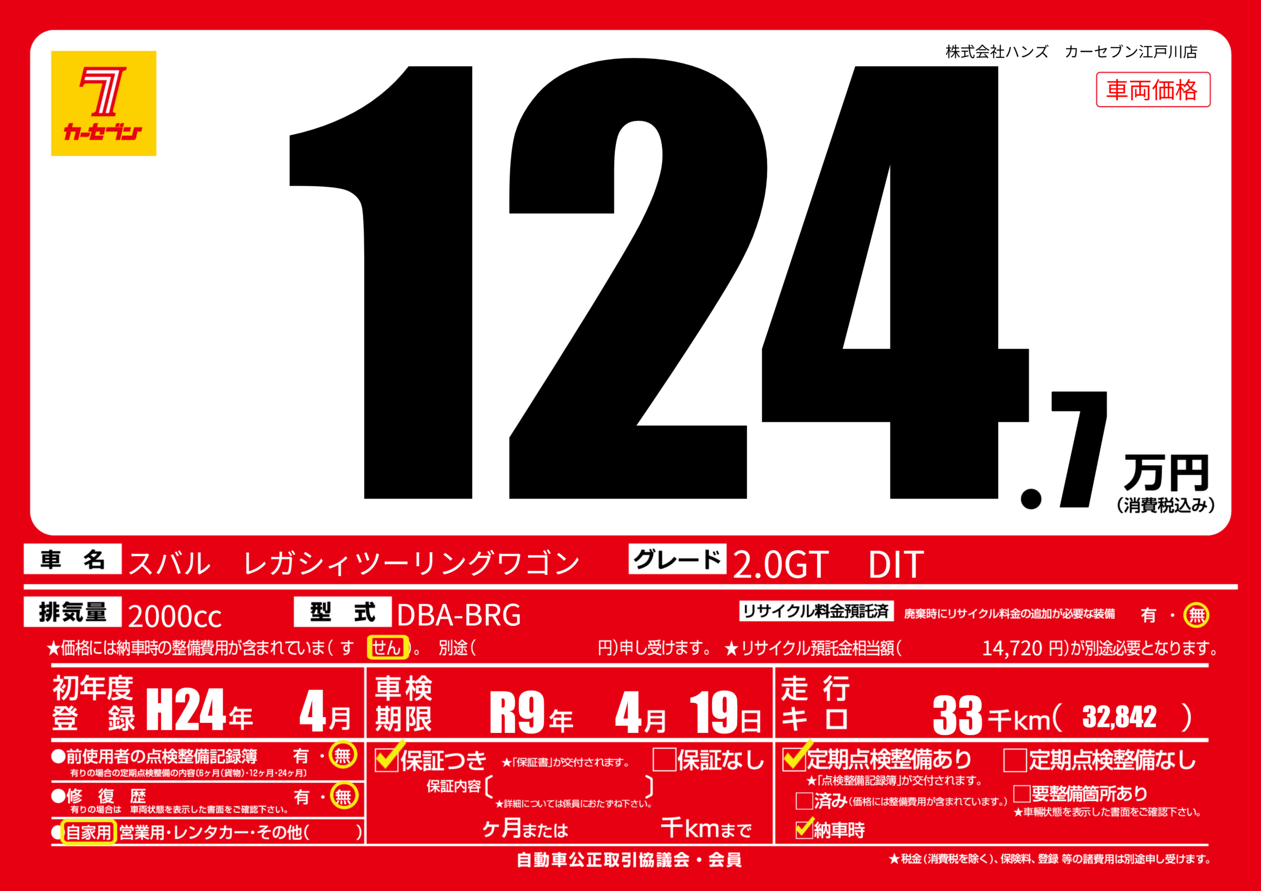 | 走行キロ | 3.3万km | 初年度登録 | H24年4月 |