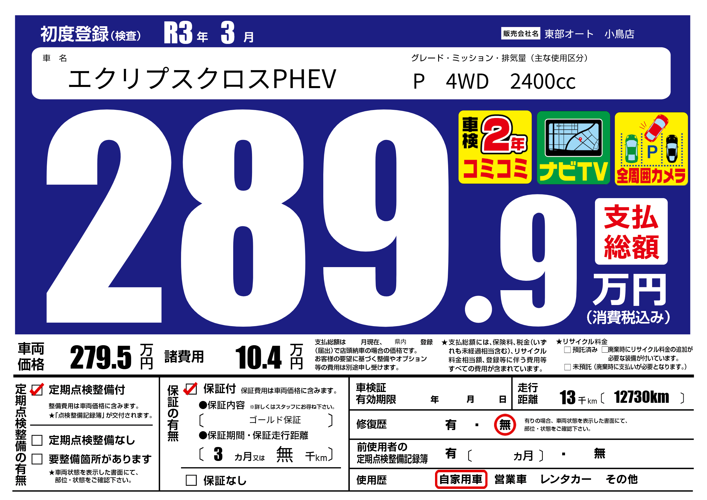 | 車名 | エクリプスクロスPHEV | グレード ミッション 排気量 |