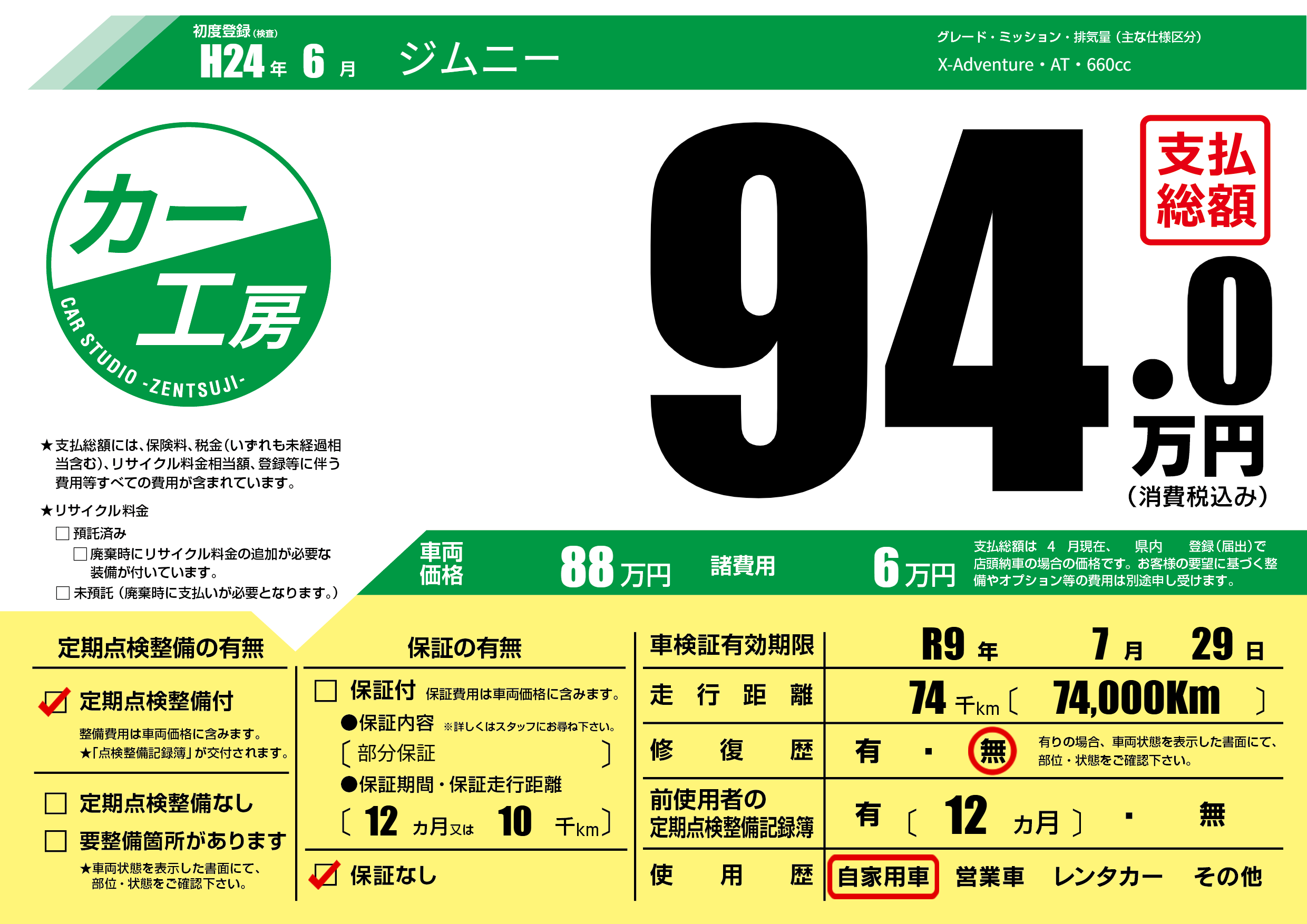 | 車名 | ジムニー | グレード ミッション 排気量 |