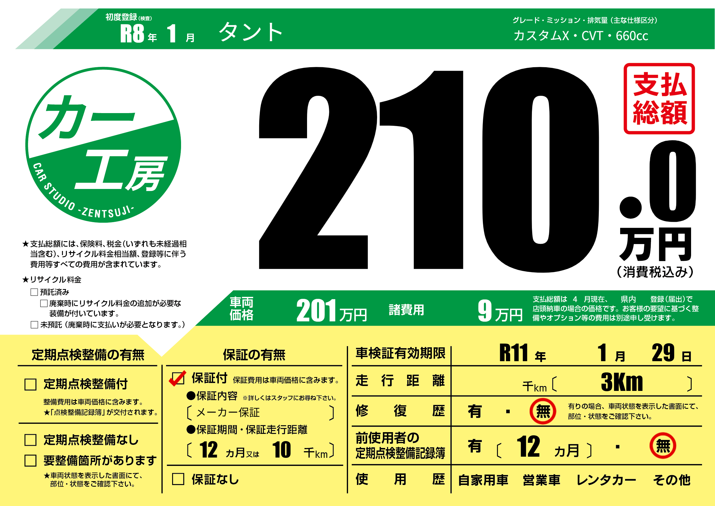 | 車名 | タント | グレード ミッション 排気量 |