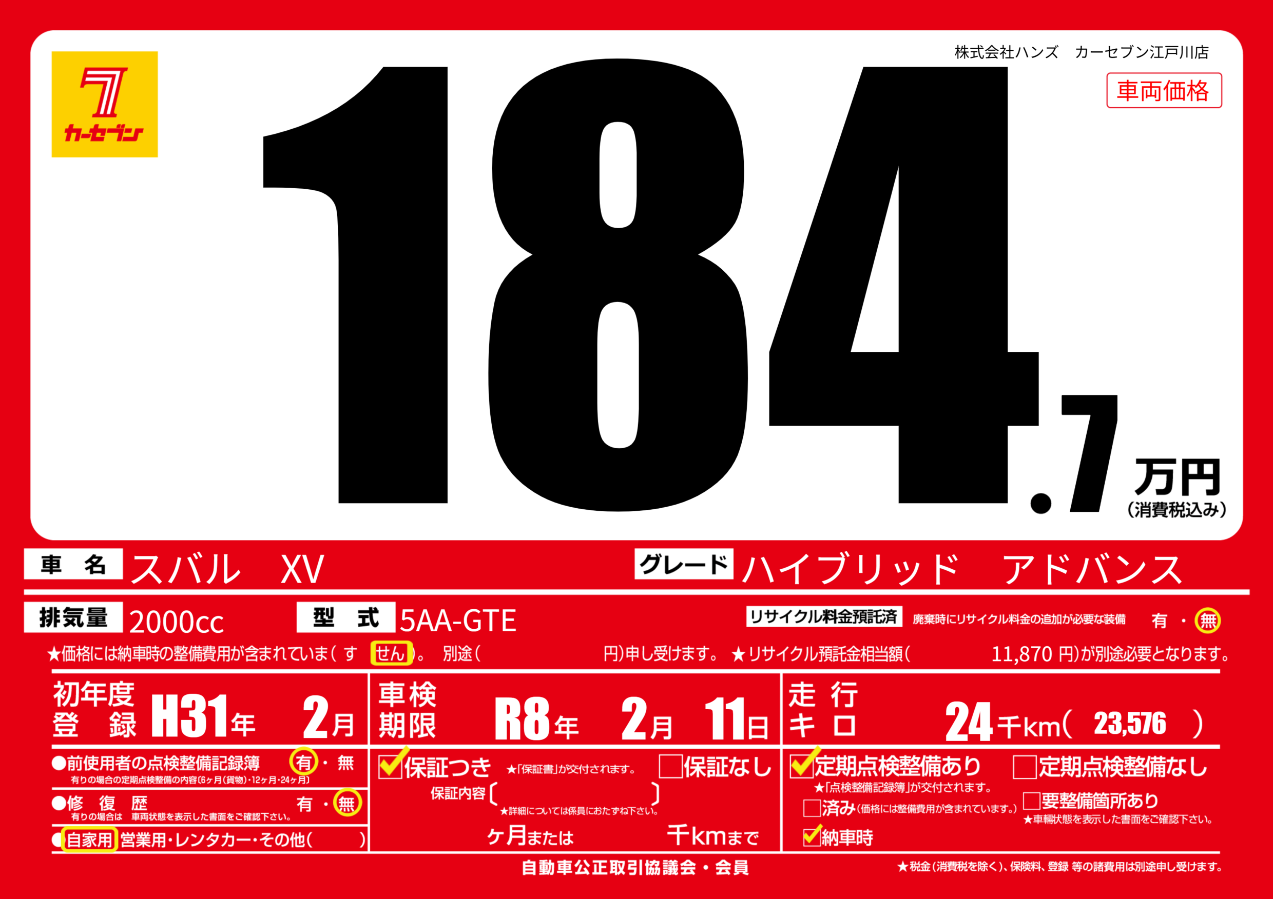| 車検制限 | R8年 2月 11日 | ||
