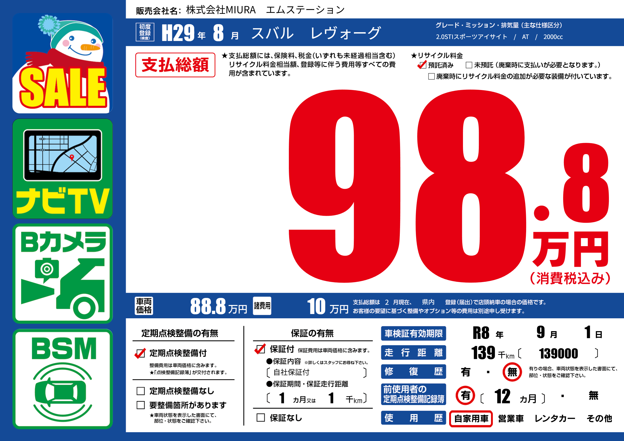 なし | 車検制限 | R8年9月1月 |