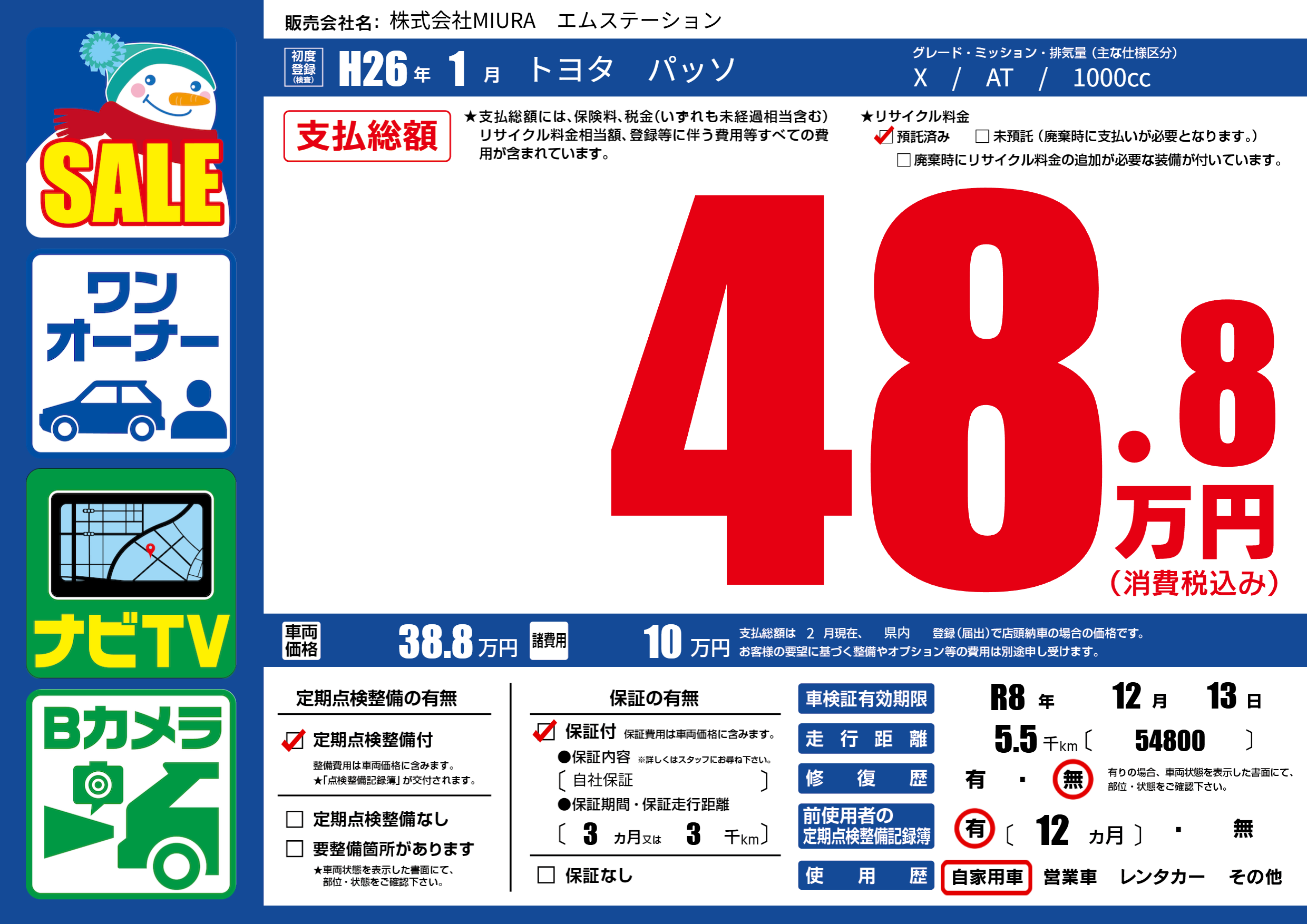 | 車名 | トヨタ パッソ | グレード ミッション 排気量 |