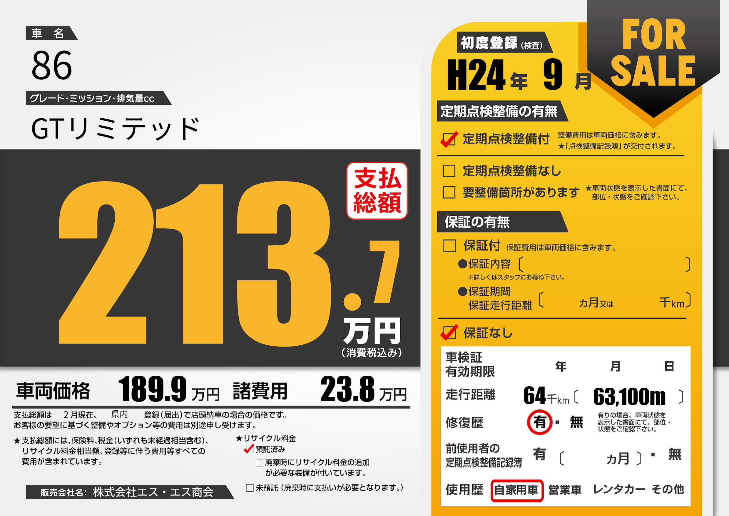 | 走行キロ | 6.4万km | 初年度登録 | H24年9月 |