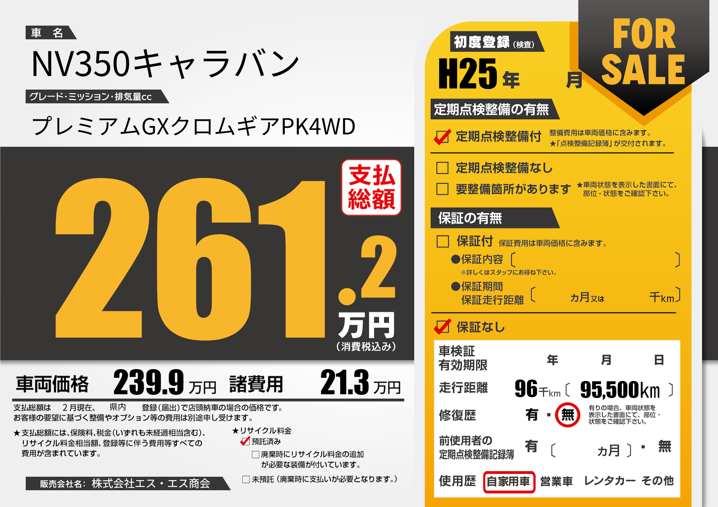 | 車名 | NV350キャラバン | グレード ミッション 排気量 |