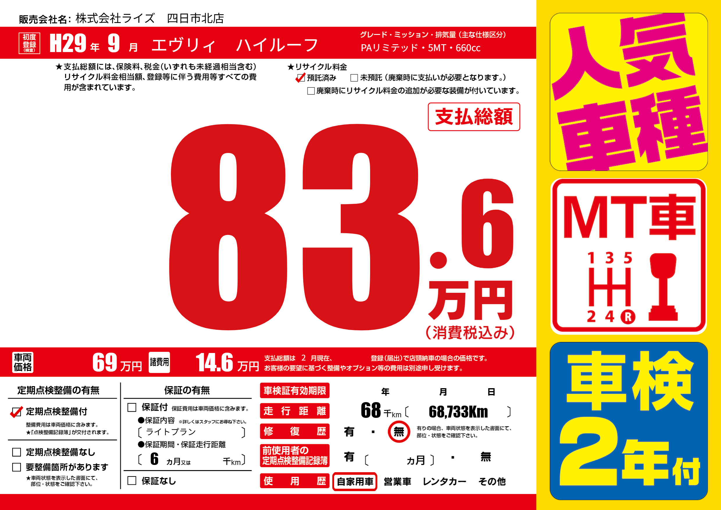 | 走行キロ | 6.8万km | 初年度登録 | H29年9月 |