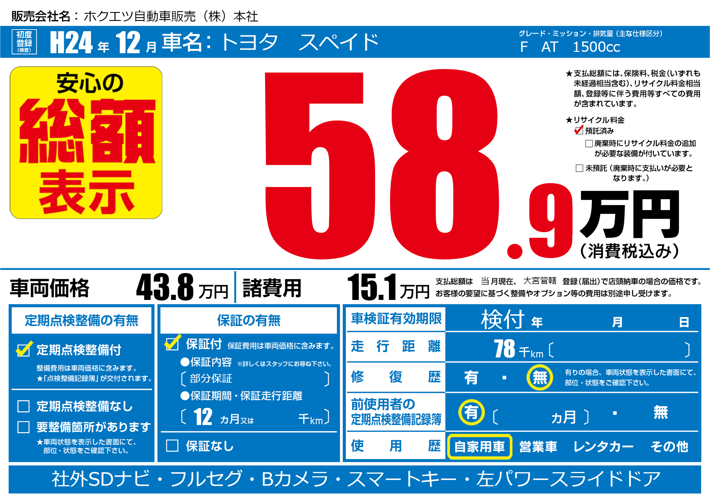 | 車名 | トヨタ スペイド | グレード ミッション 排気量 |