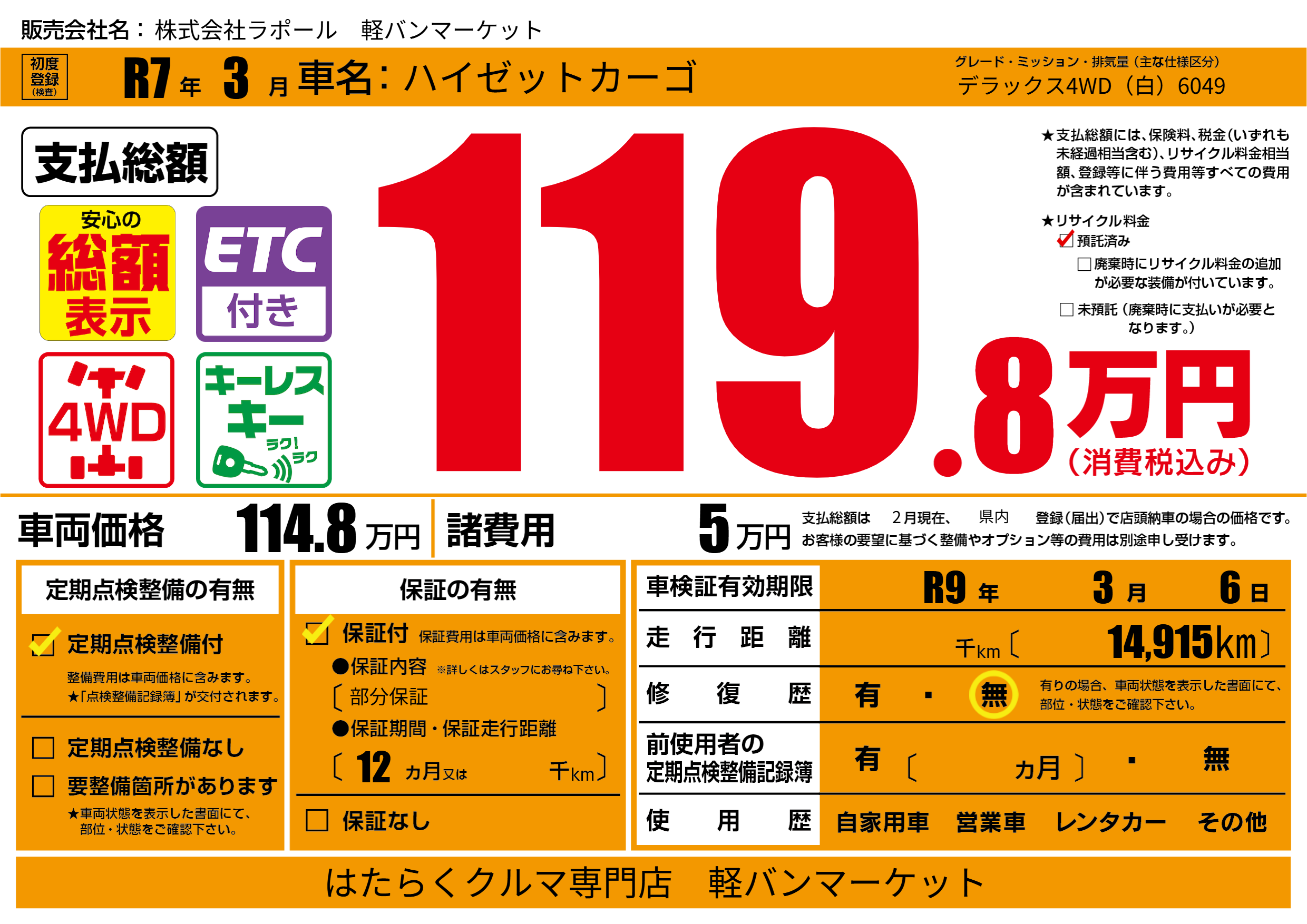 | 車名 | ハイゼットカーゴ | グレード ミッション 排気量 |