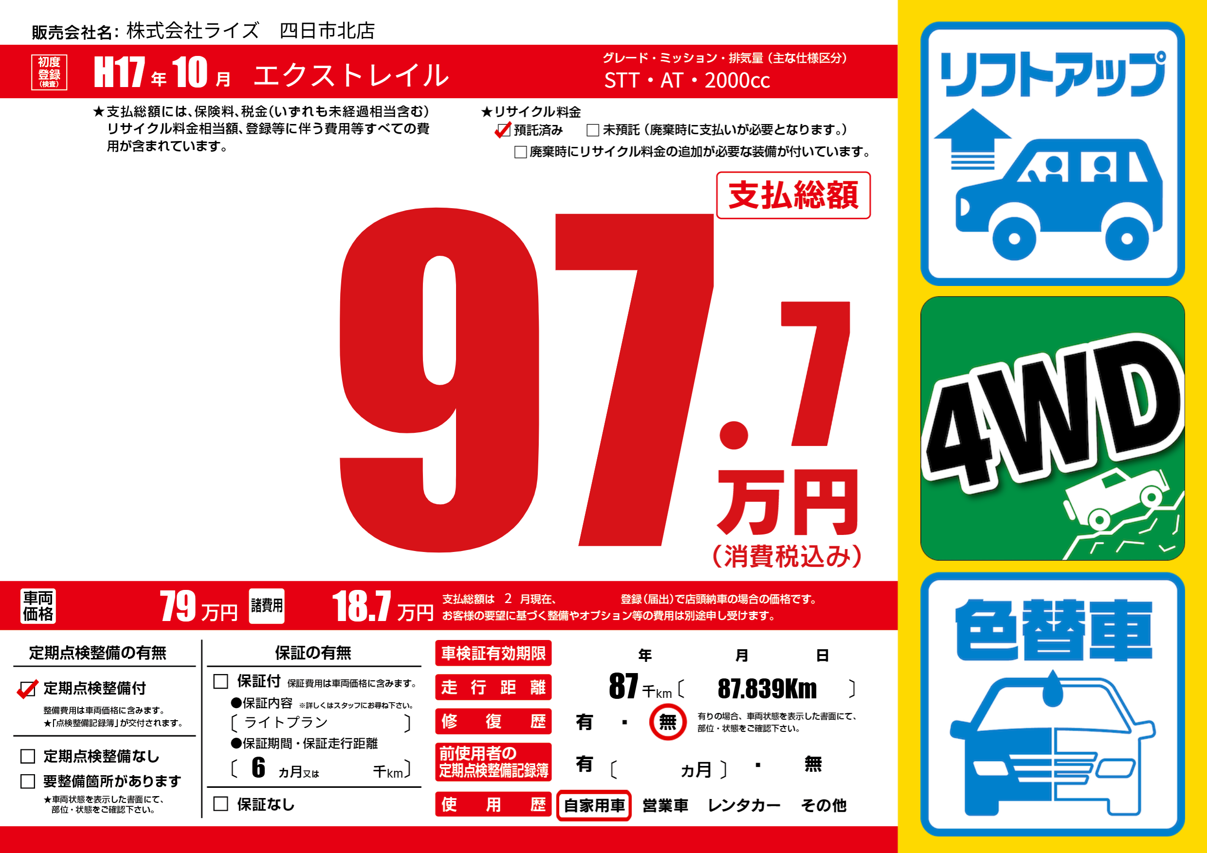 | 走行キロ | 8.7万km | 初年度登録 | H17年10月 |