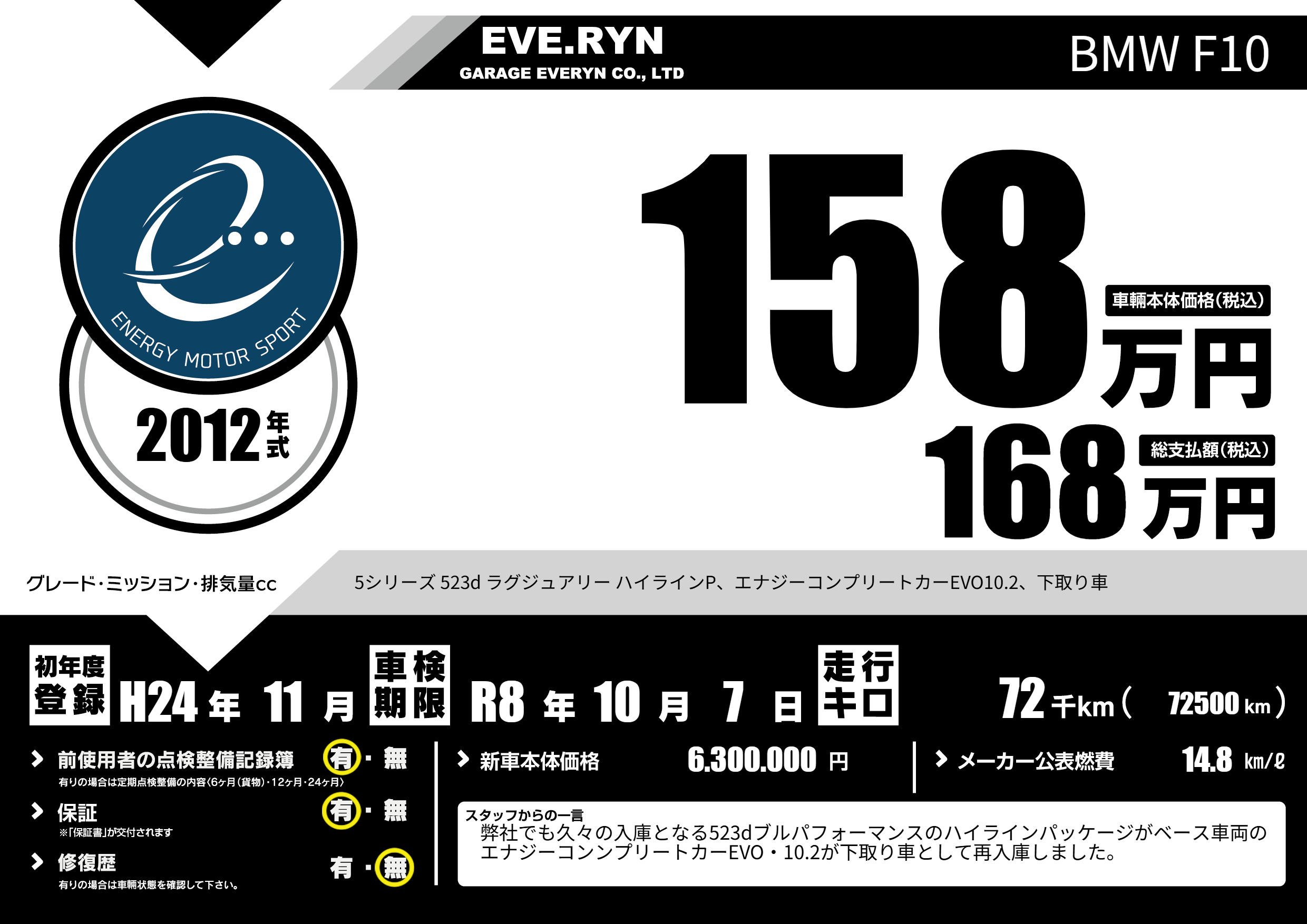 5シリーズ 523d ラグジュアリー ハイラインP、エナジーコンプリートカーEVO10.2、下取り車 |