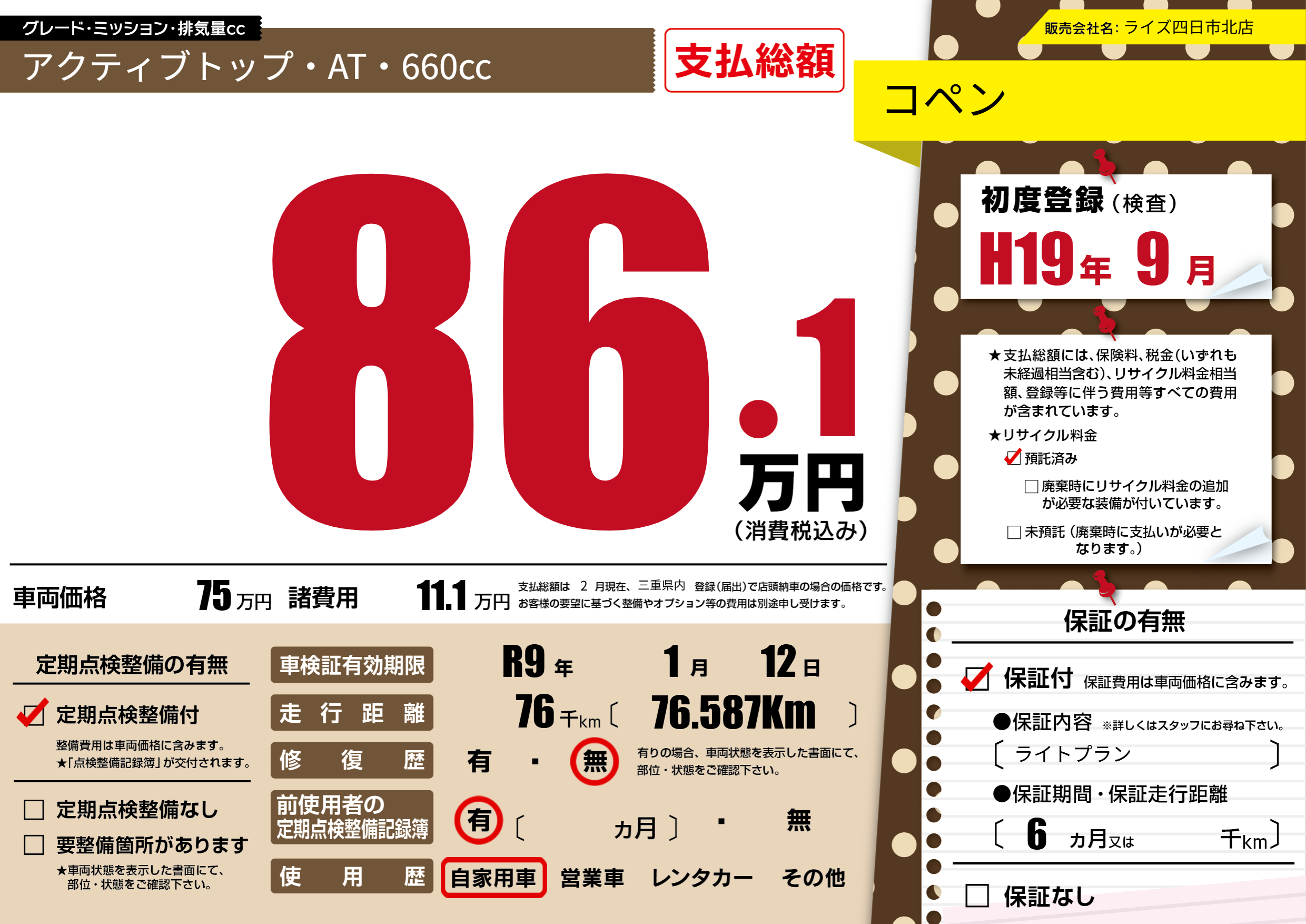 | 走行キロ | 7.6万km | 初年度登録 | H19年9月 |