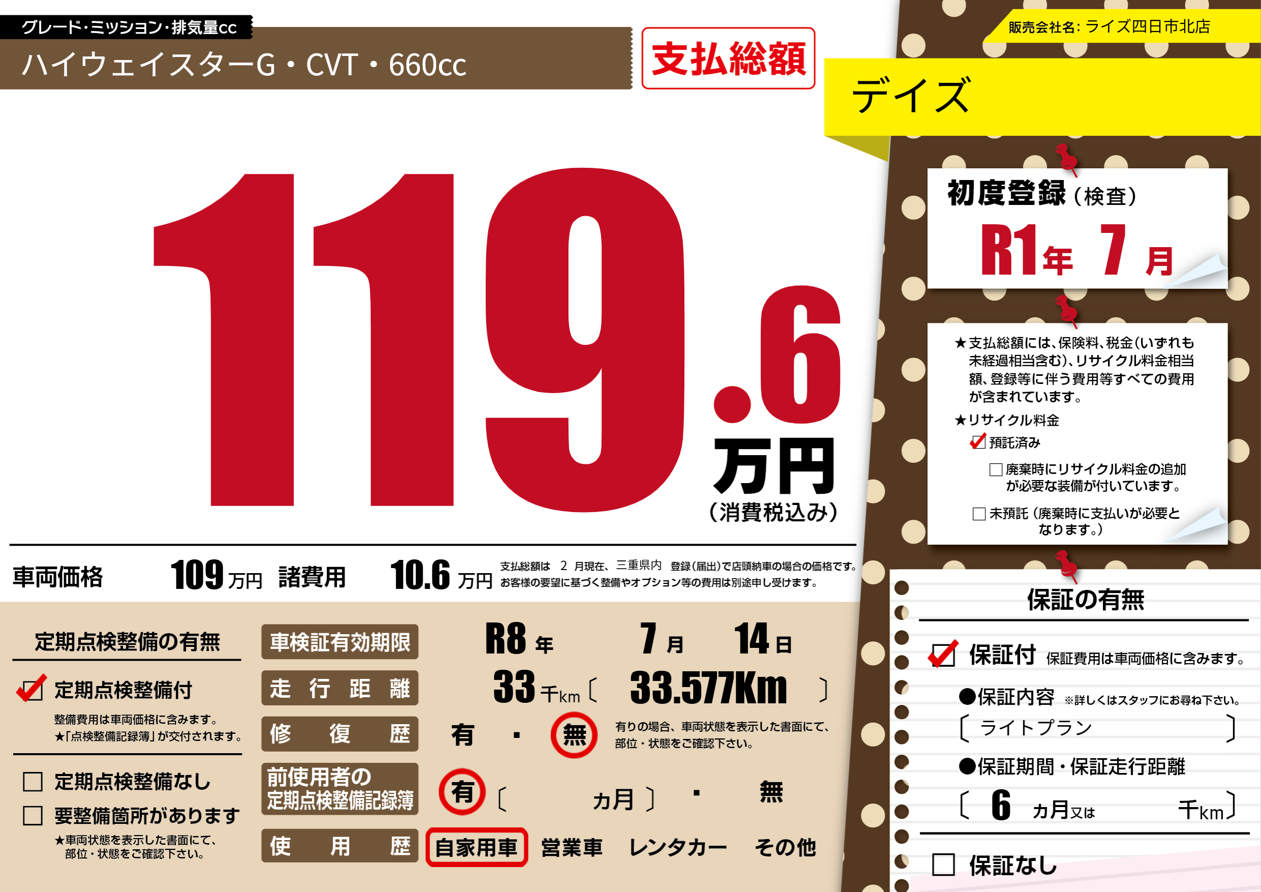 | 走行キロ | 3.3万km | 初年度登録 | R1年7月 |