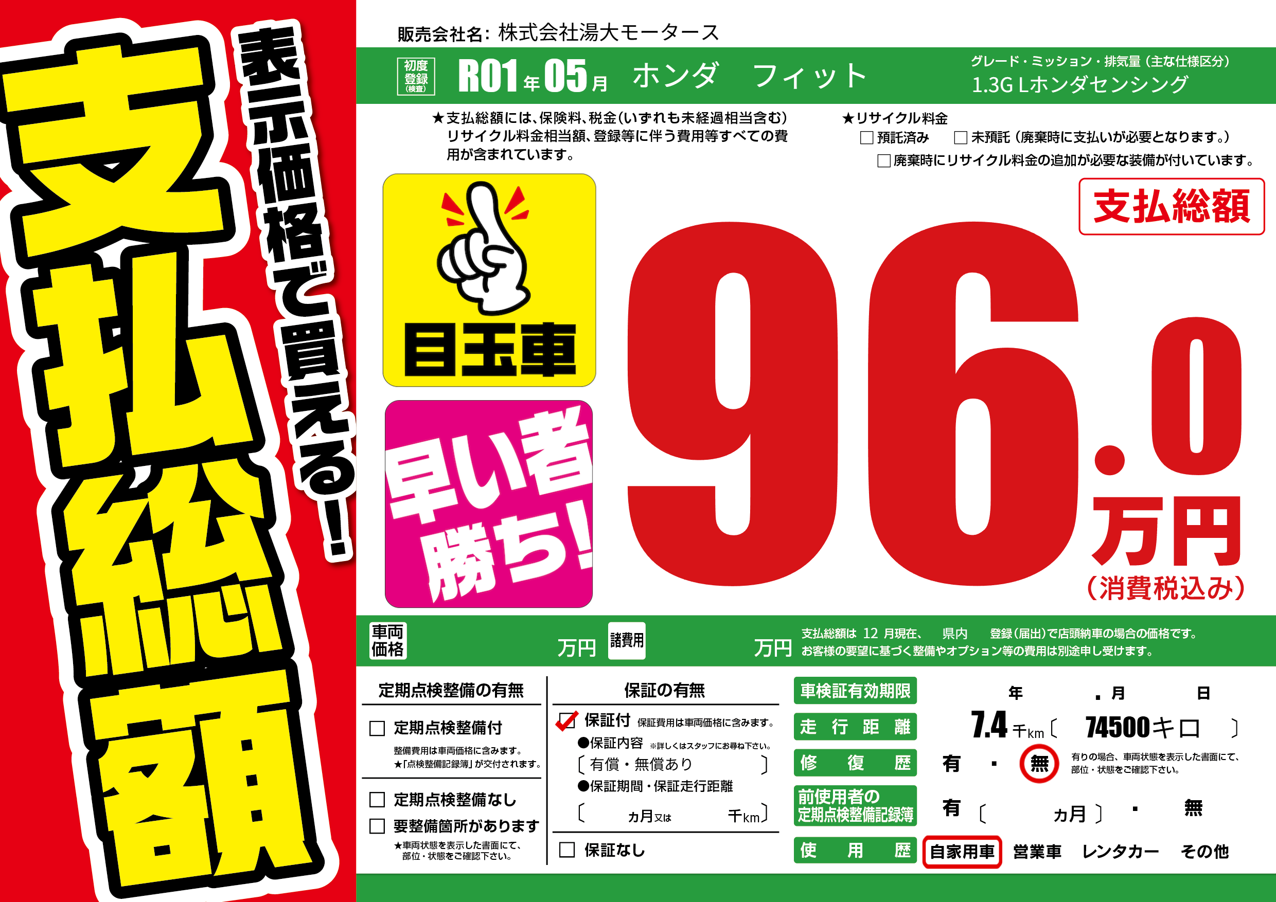 保証付き 保証内容(有償・無償あり) ---ヶ月または()千kmまで |