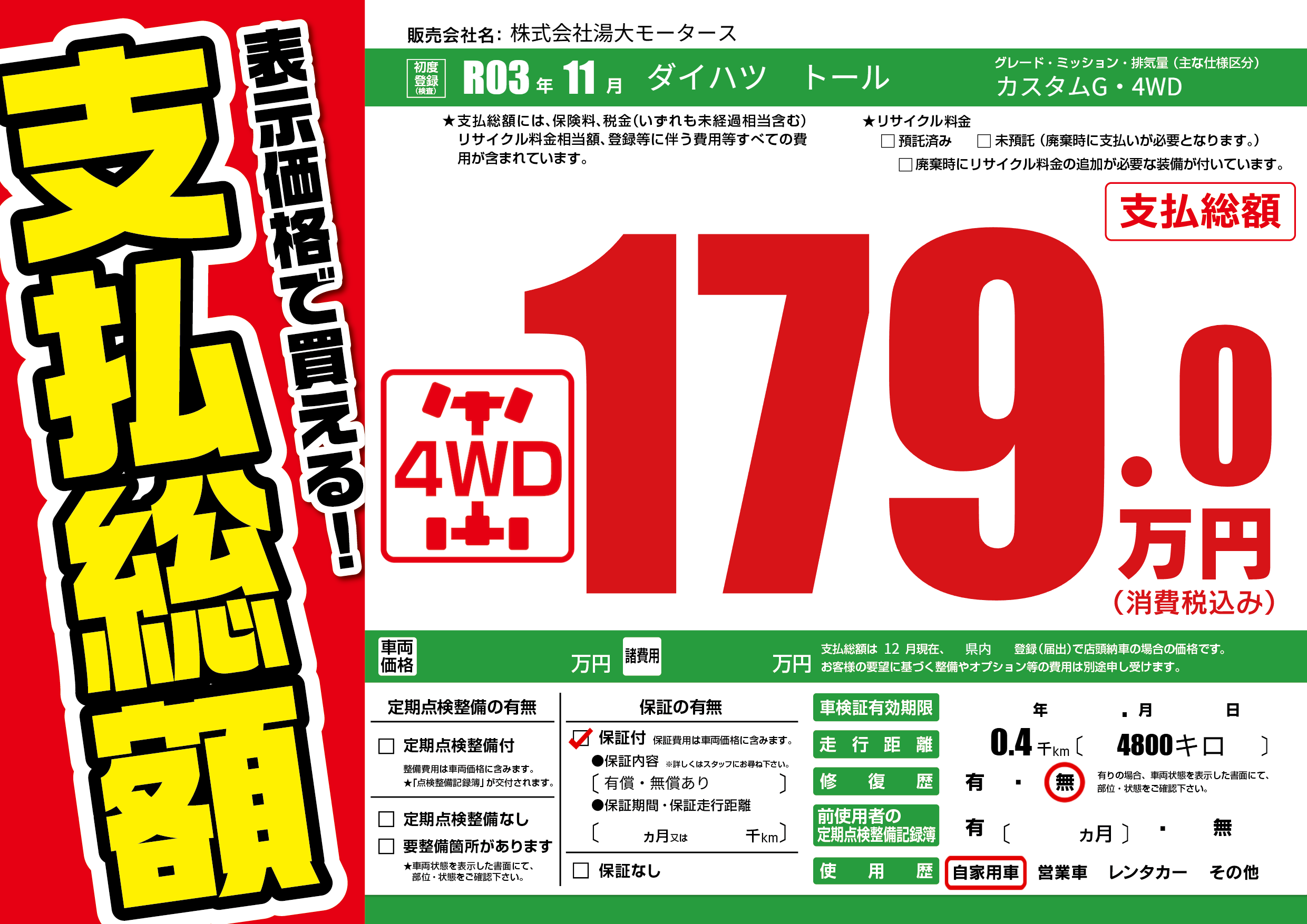 保証付き 保証内容(有償・無償あり) ---ヶ月または()千kmまで |