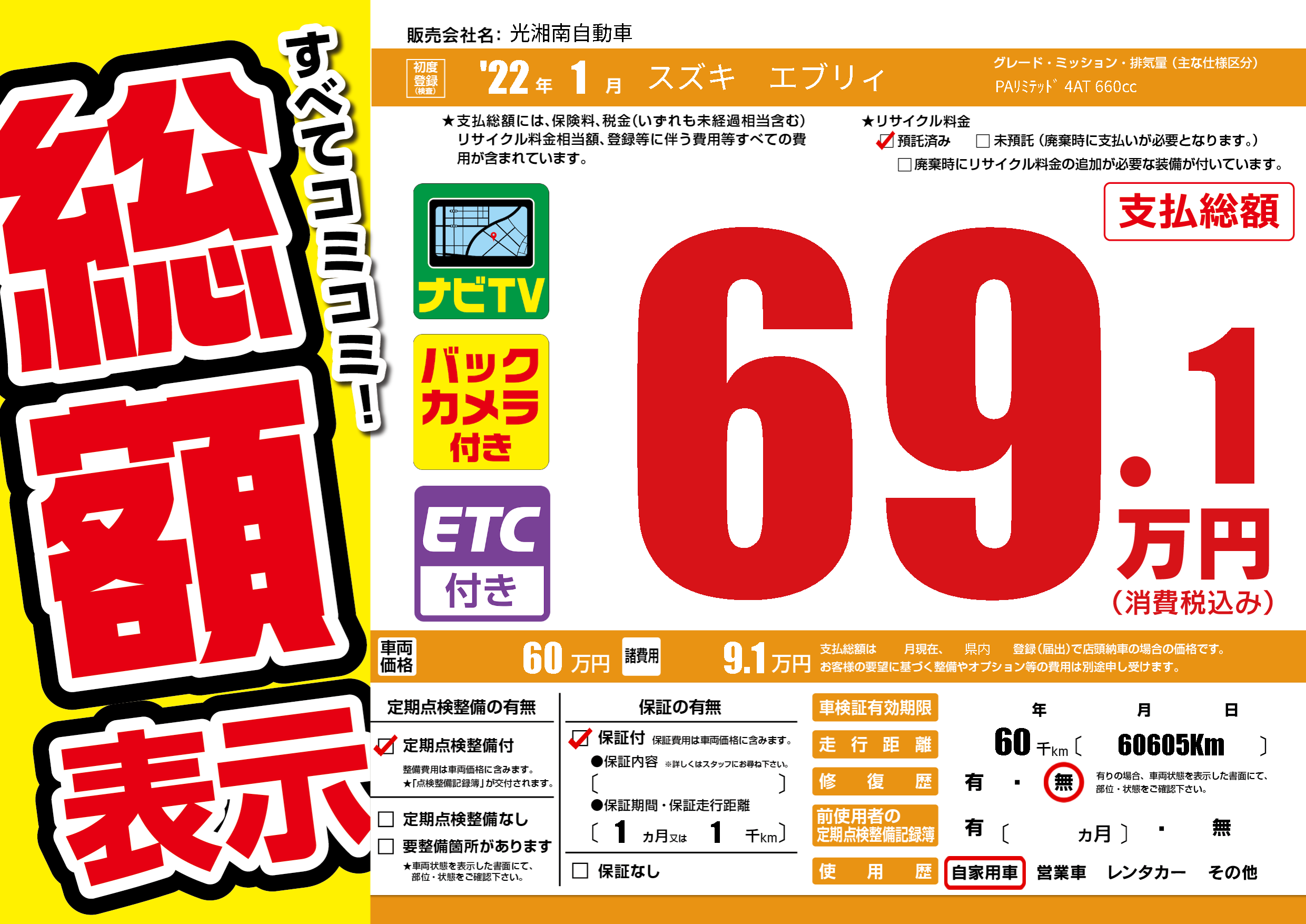| 車名 | スズキ エブリィ | グレード ミッション 排気量 |