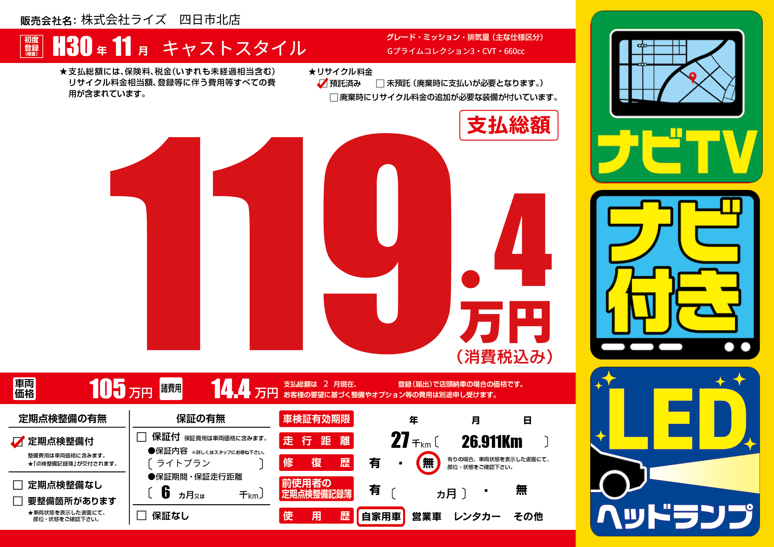 | 走行キロ | 2.7万km | 初年度登録 | H30年11月 |