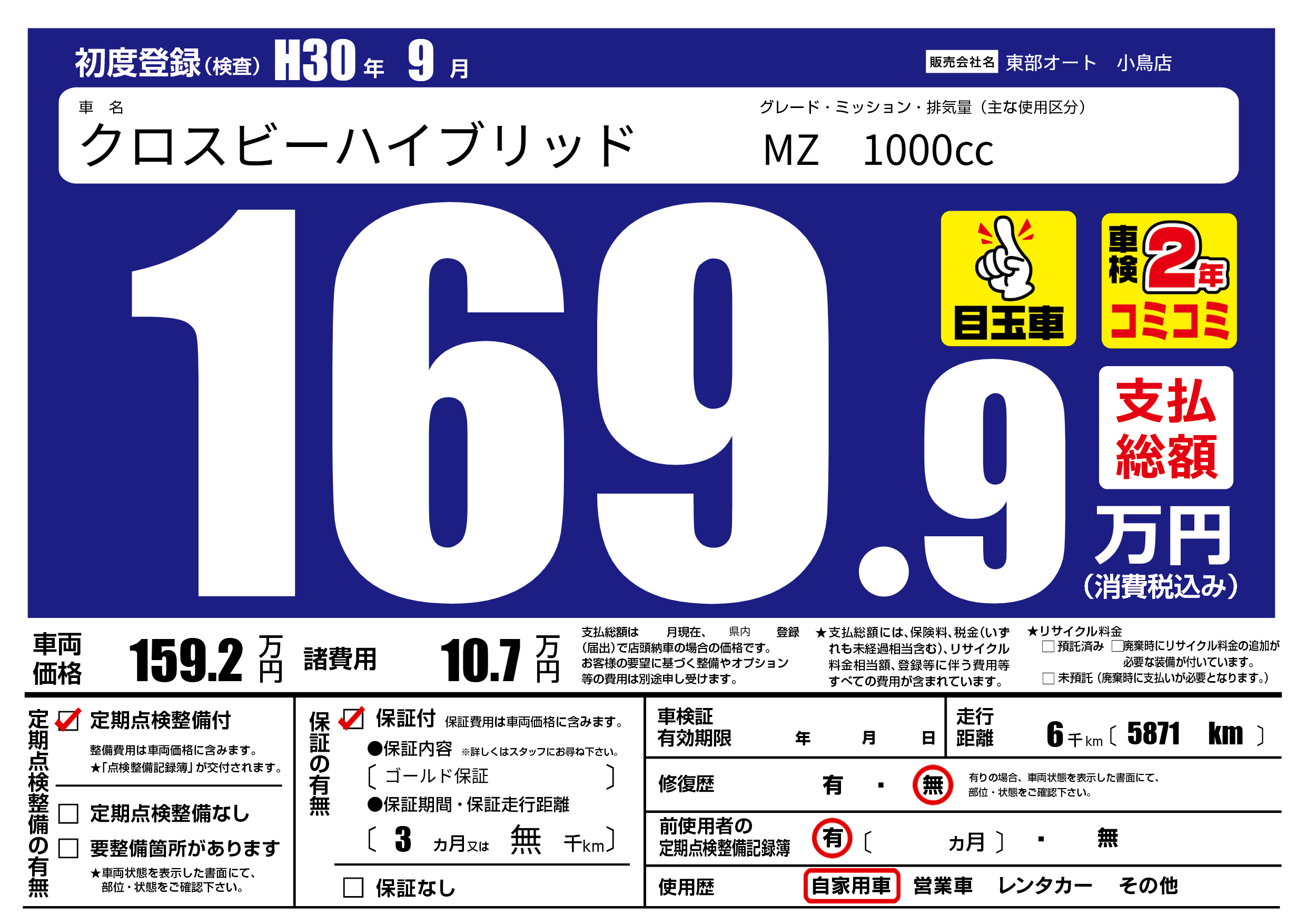 | 走行キロ | 0.6万km | 初年度登録 | H30年9月 |