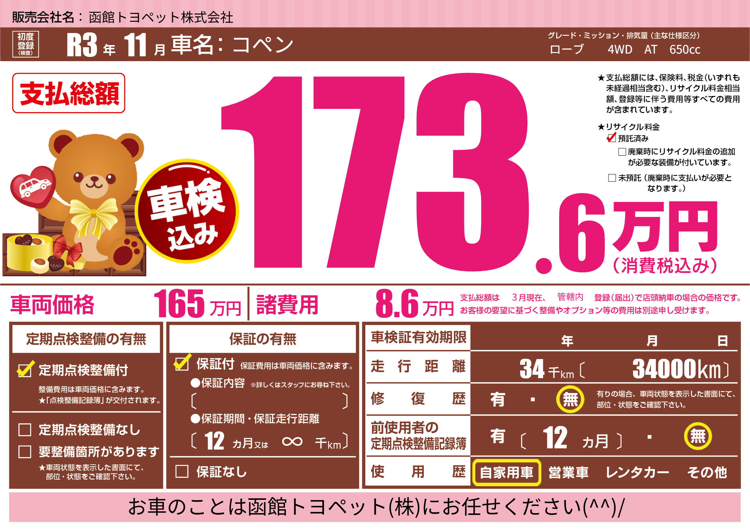 | 走行キロ | 3.4万km | 初年度登録 | R3年11月 |