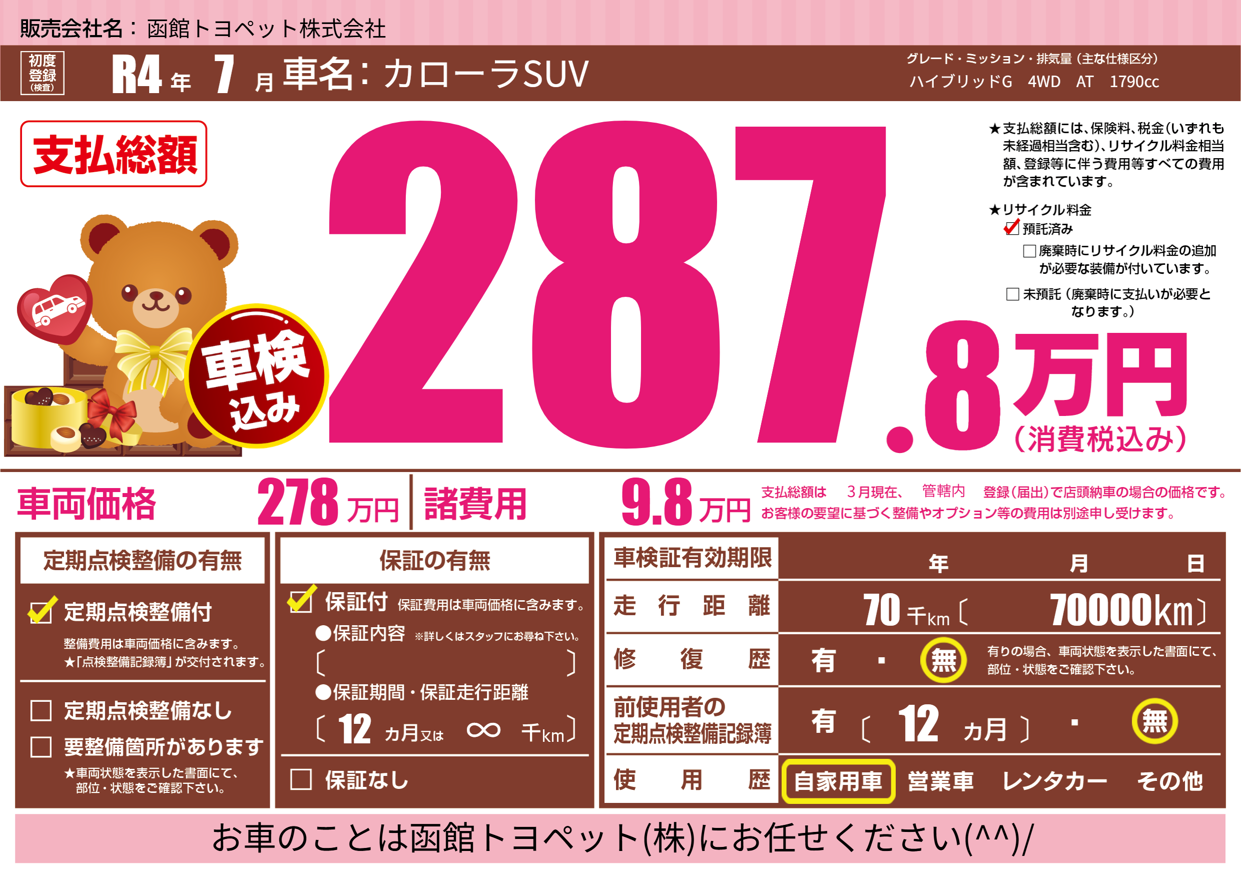 | 車名 | カローラSUV | グレード ミッション 排気量 |