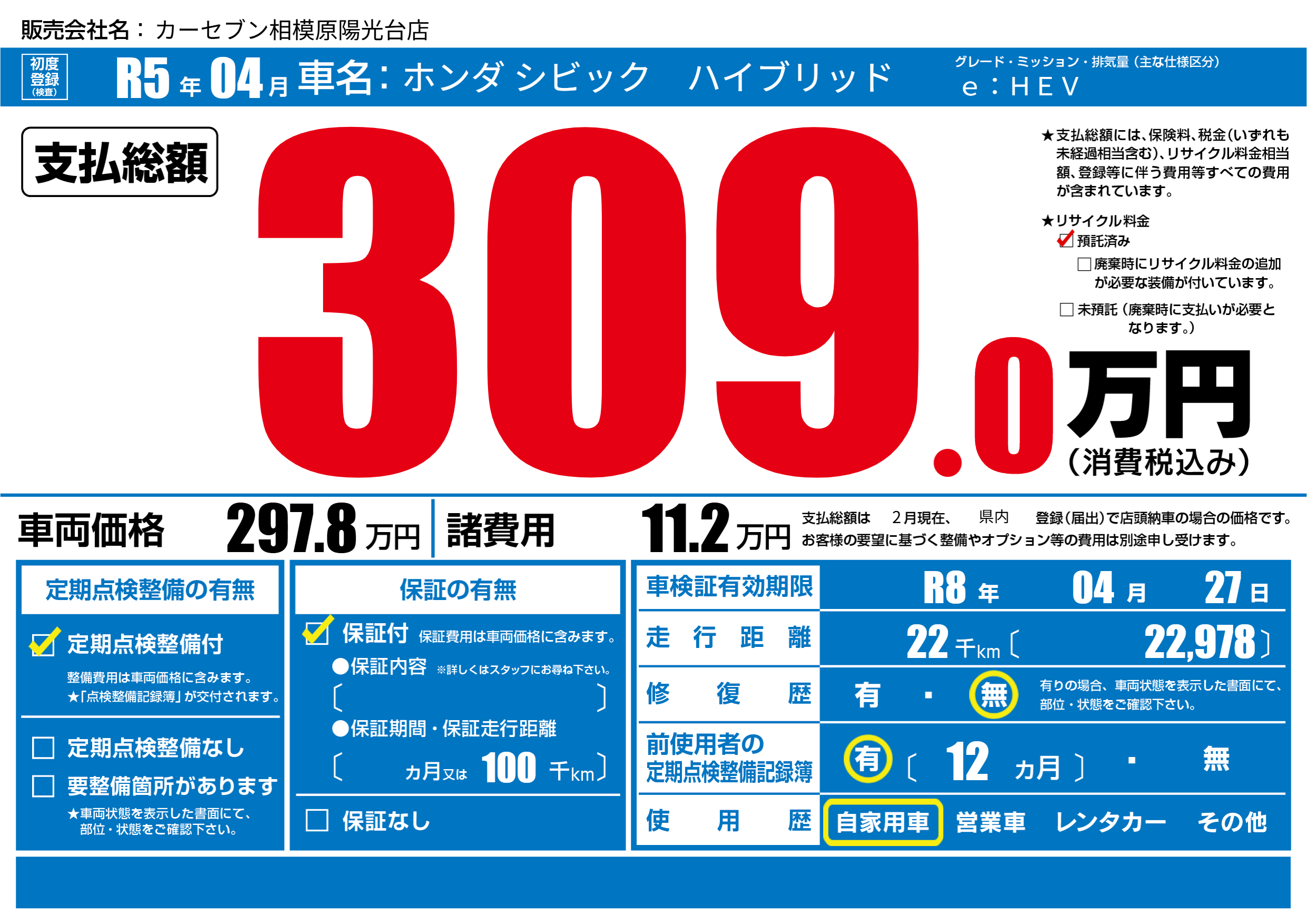 | 車名 | ホンダ シビック ハイブリッド | グレード ミッション 排気量 |