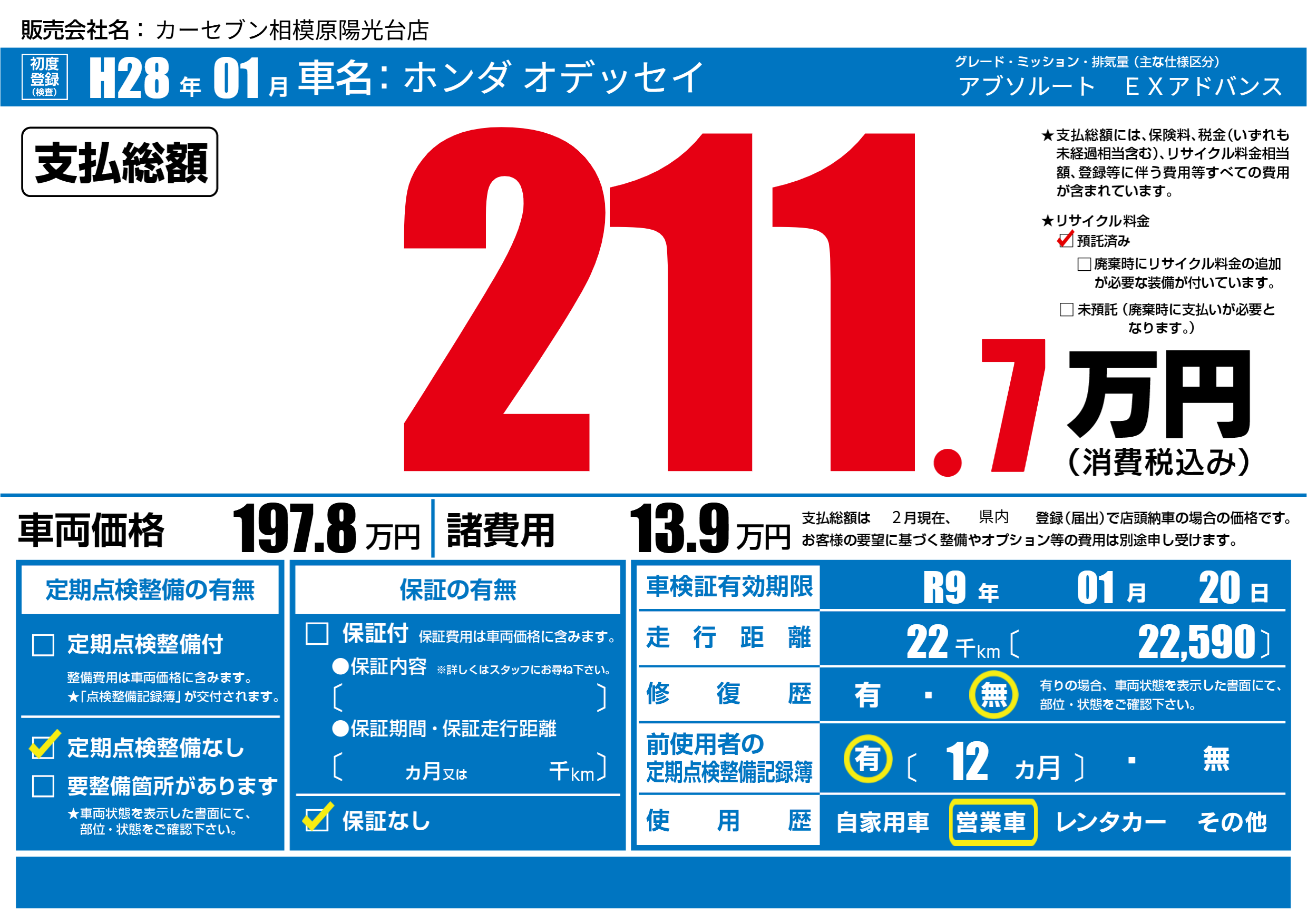 | 車検制限 | R9年 01月 20日 | ||