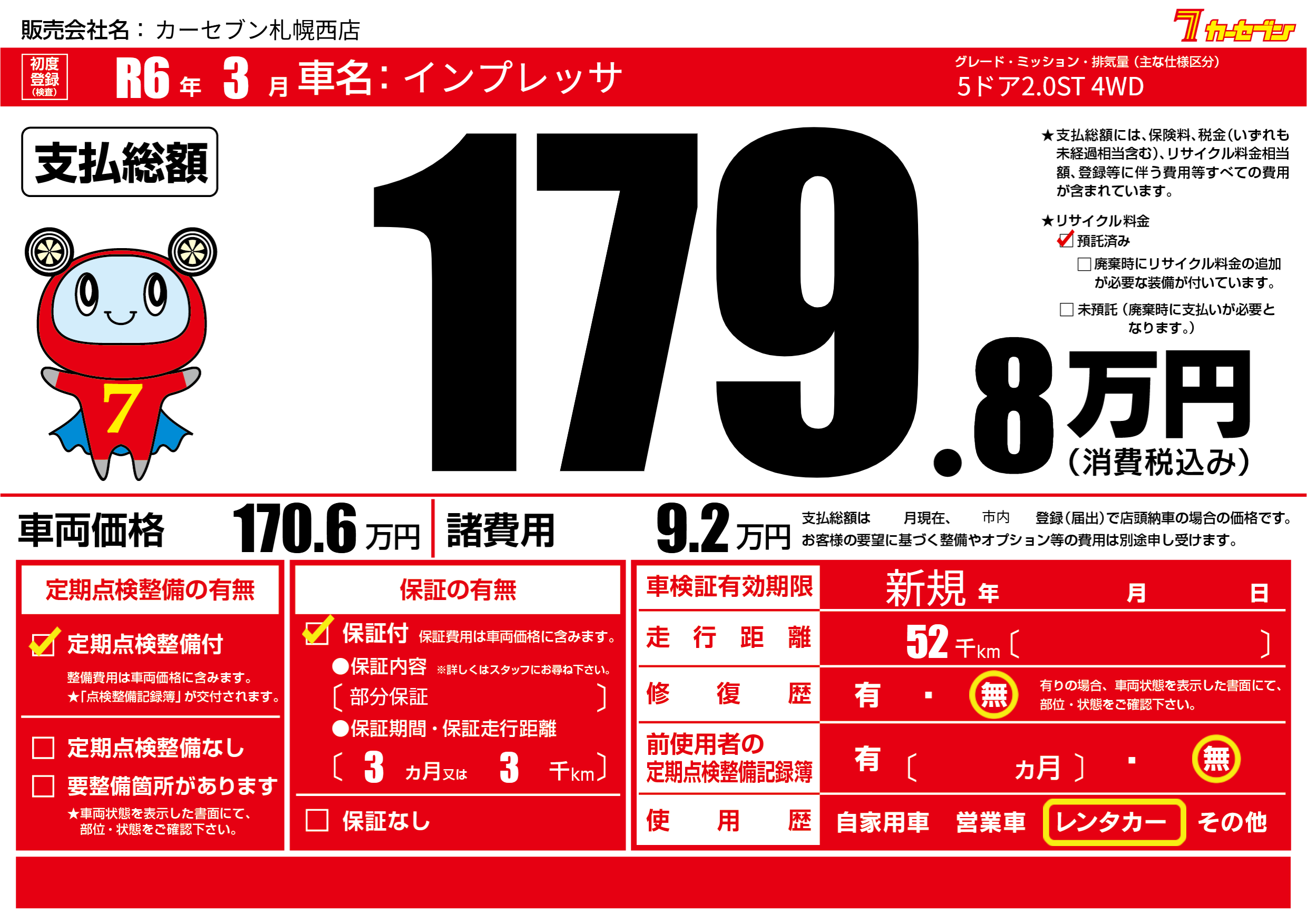 | 車名 | インプレッサ | グレード ミッション 排気量 |