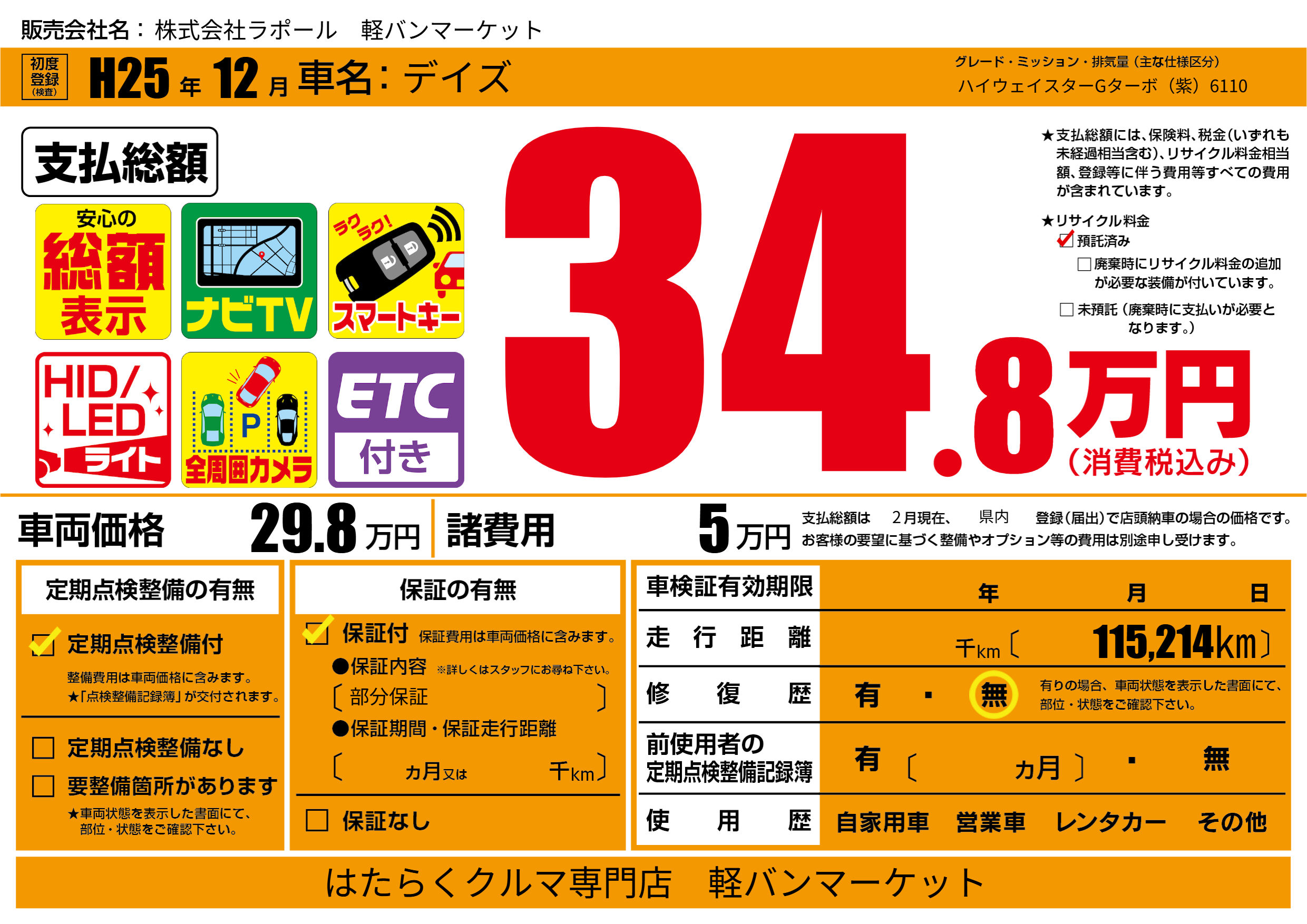 | 走行キロ | - | 初年度登録 | H25年12月 |