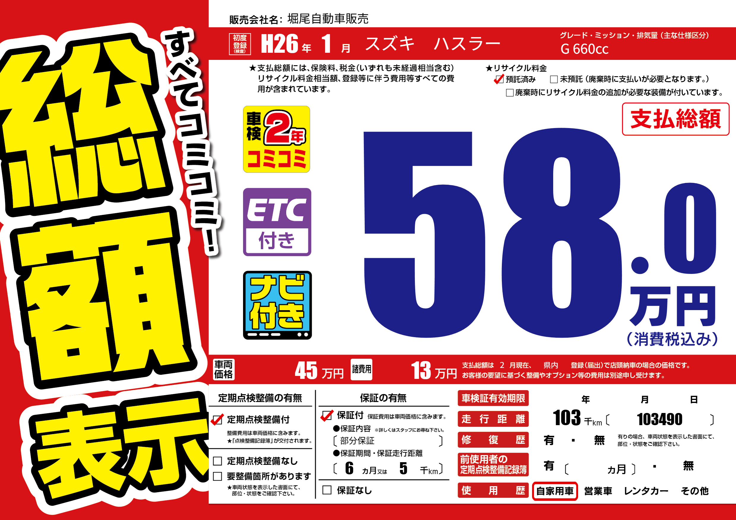 | 走行キロ | 10.3万km | 初年度登録 | H26年1月 |