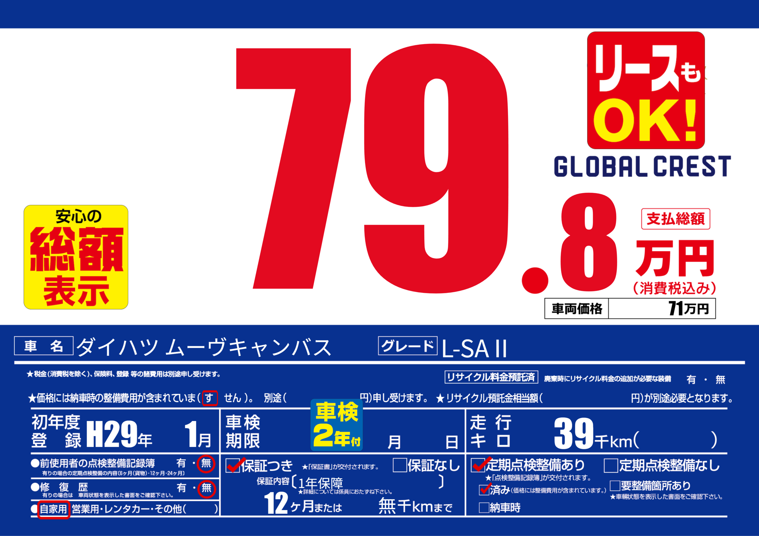 | 定期点検整備 | 定期点検整備あり 定期点検整備済み | ||