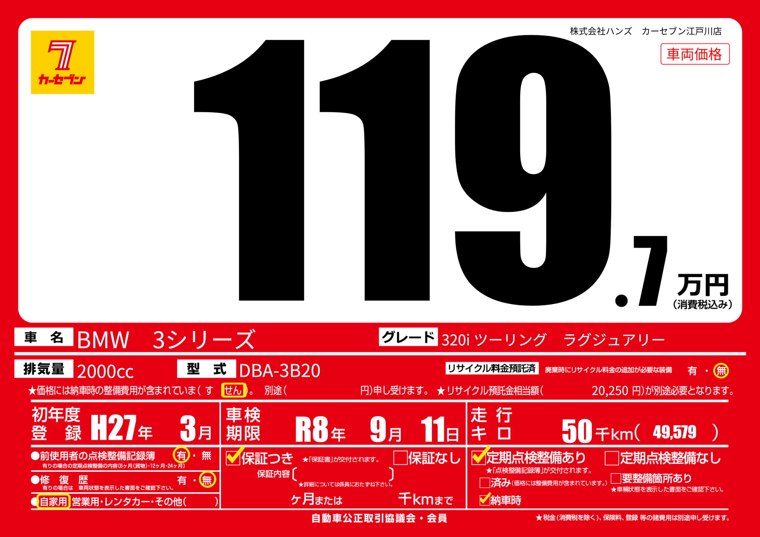 | 車名 | BMW 3シリーズ | グレード ミッション 排気量 |